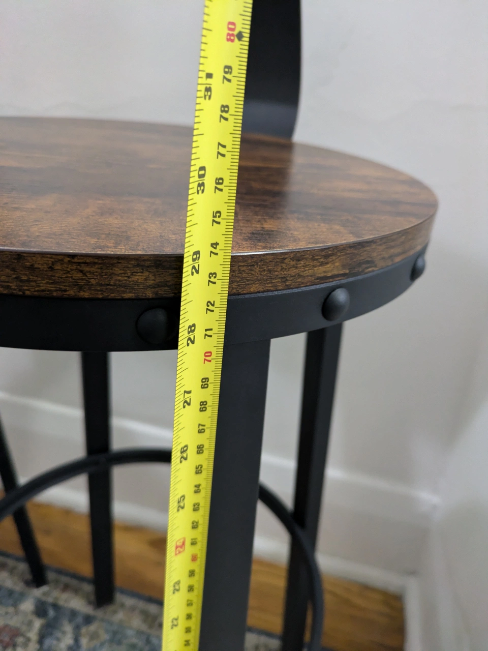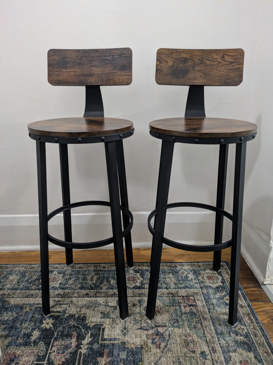 The bar stools have an industrial look with wooden seat and back with black metal legs and rivet details.