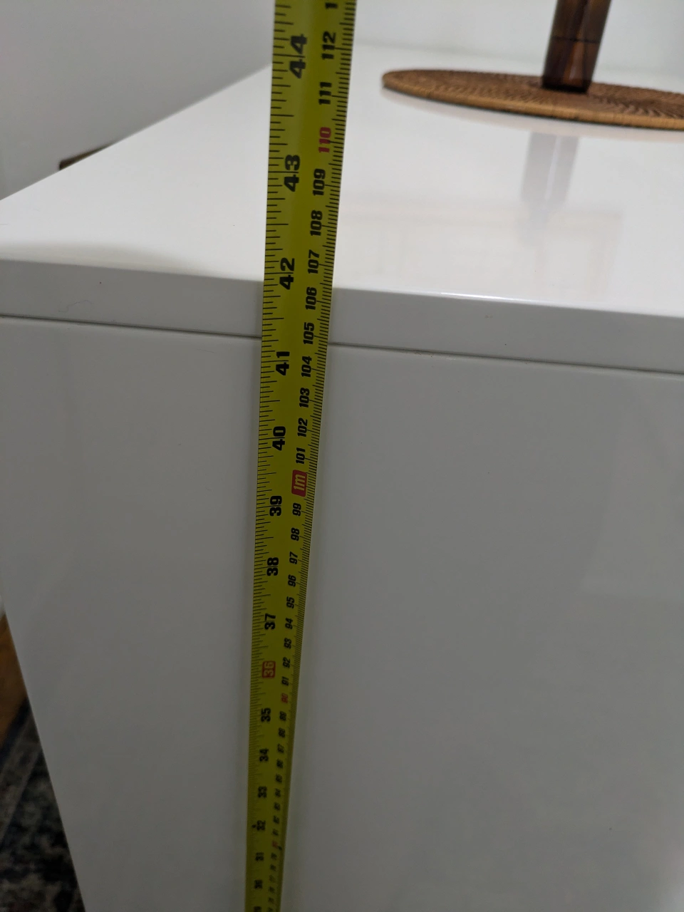 The table is approximately 48 inches long and 44 inches high. some wear and tear up top, but easily remedied with a cute runner or a nice peel and stick contact paper.
