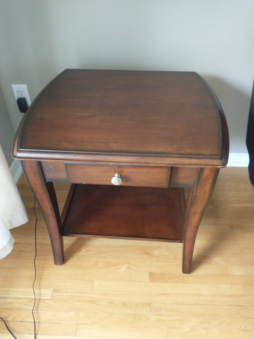 Selling a lovely brown wood end table! It features a convenient drawer and a lower shelf for extra storage or decor. It's in great shape with a slight imperfection.