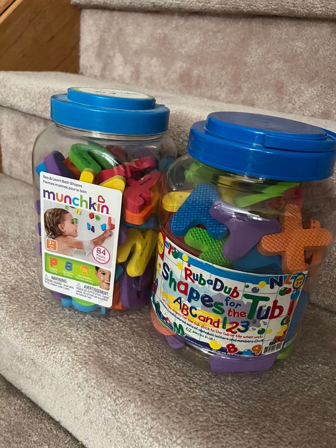 I have two tubs of bath shapes for free. One is Munchkin Sea & Learn Bath Shapes, recommended for ages 3+. The other is RubaDub Shapes for the Tub, also recommended for ages 2+. Both sets include most of the letters and numbers for fun learning in the tub!