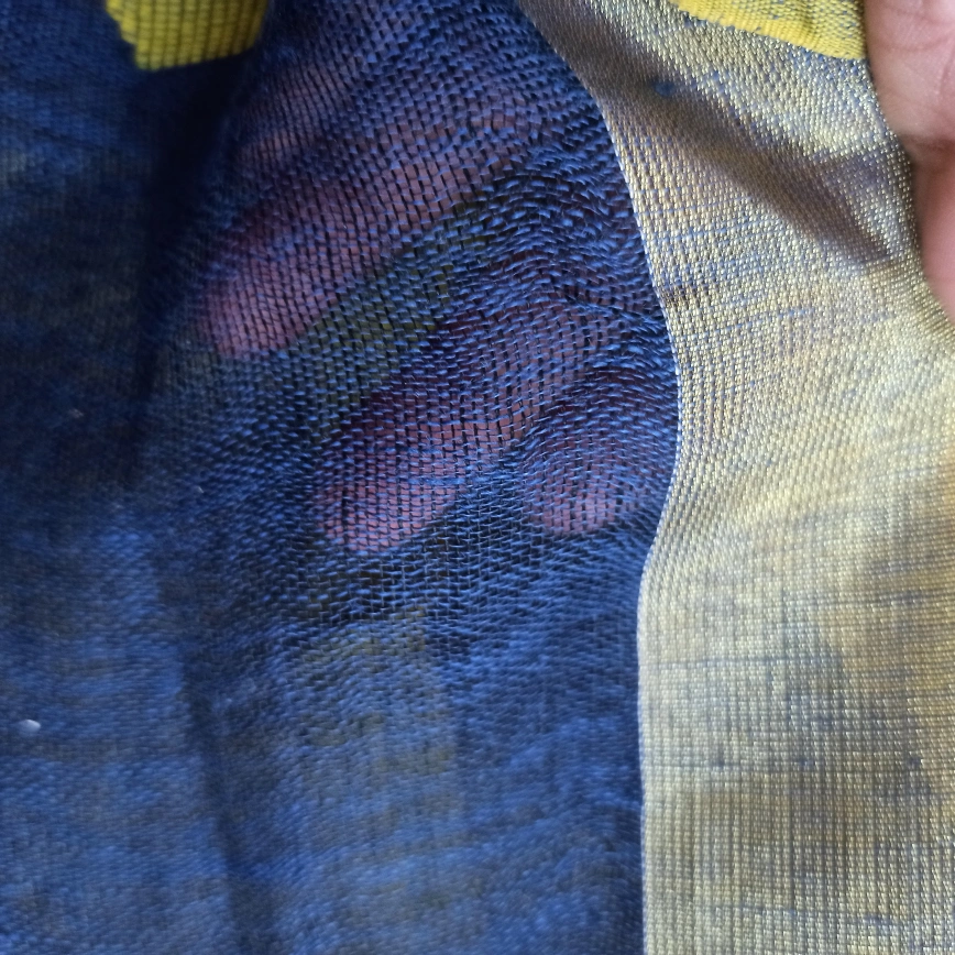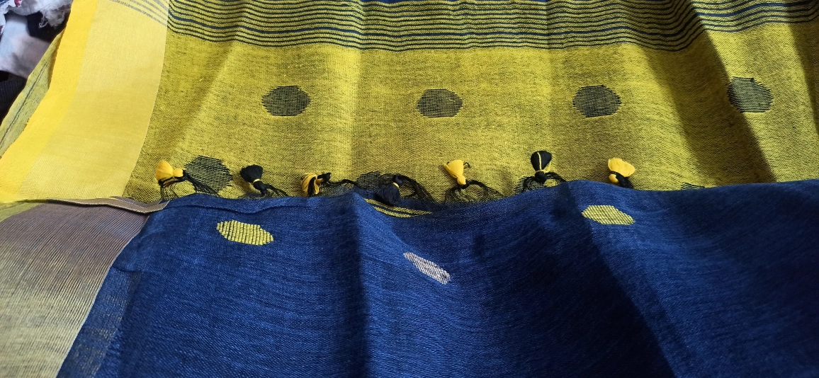This is a beautiful saree featuring a mix of yellow and blue colours. It appears to be made of cotton, making it comfortable to wear. The design includes polka dots and striped patterns.