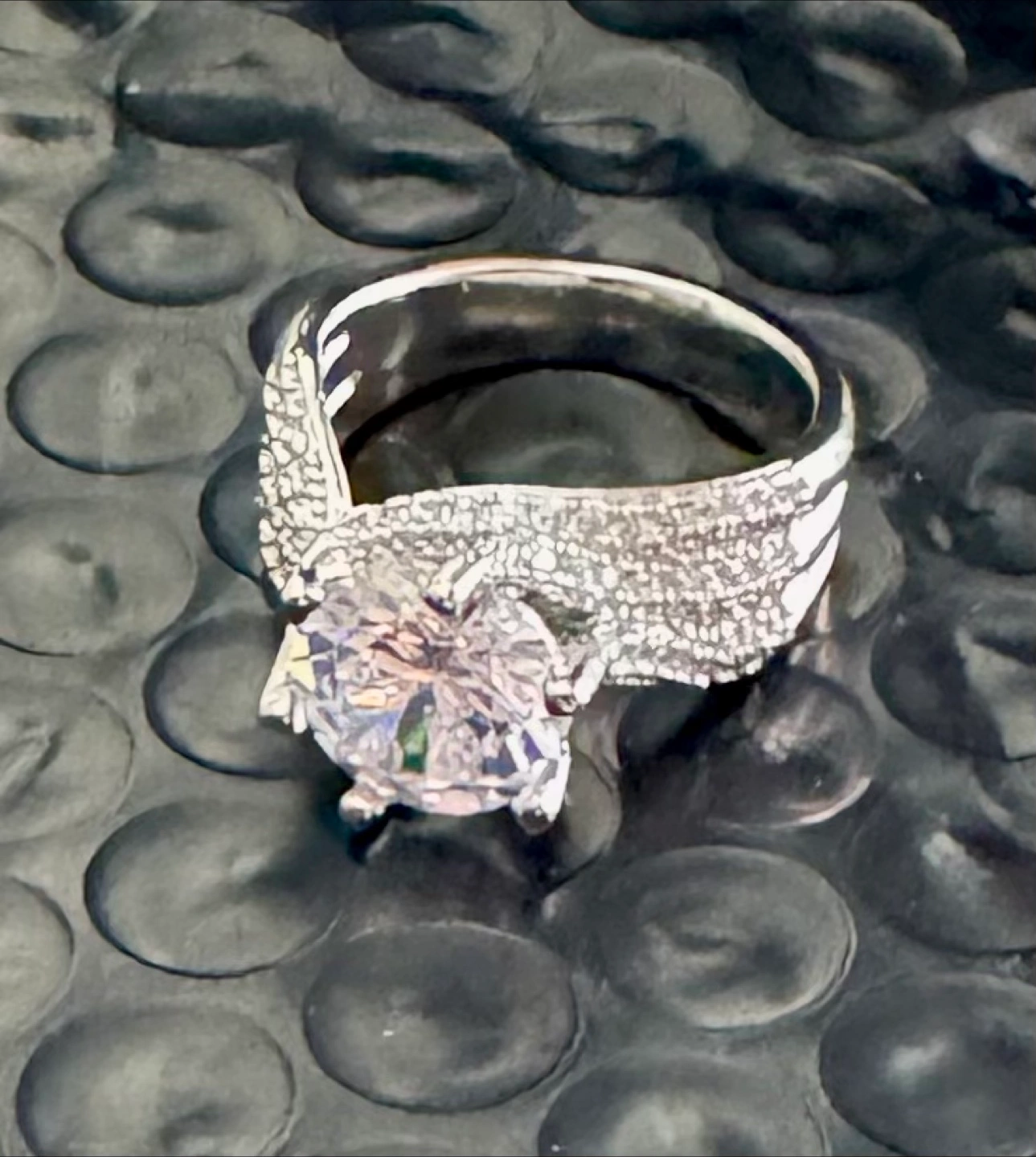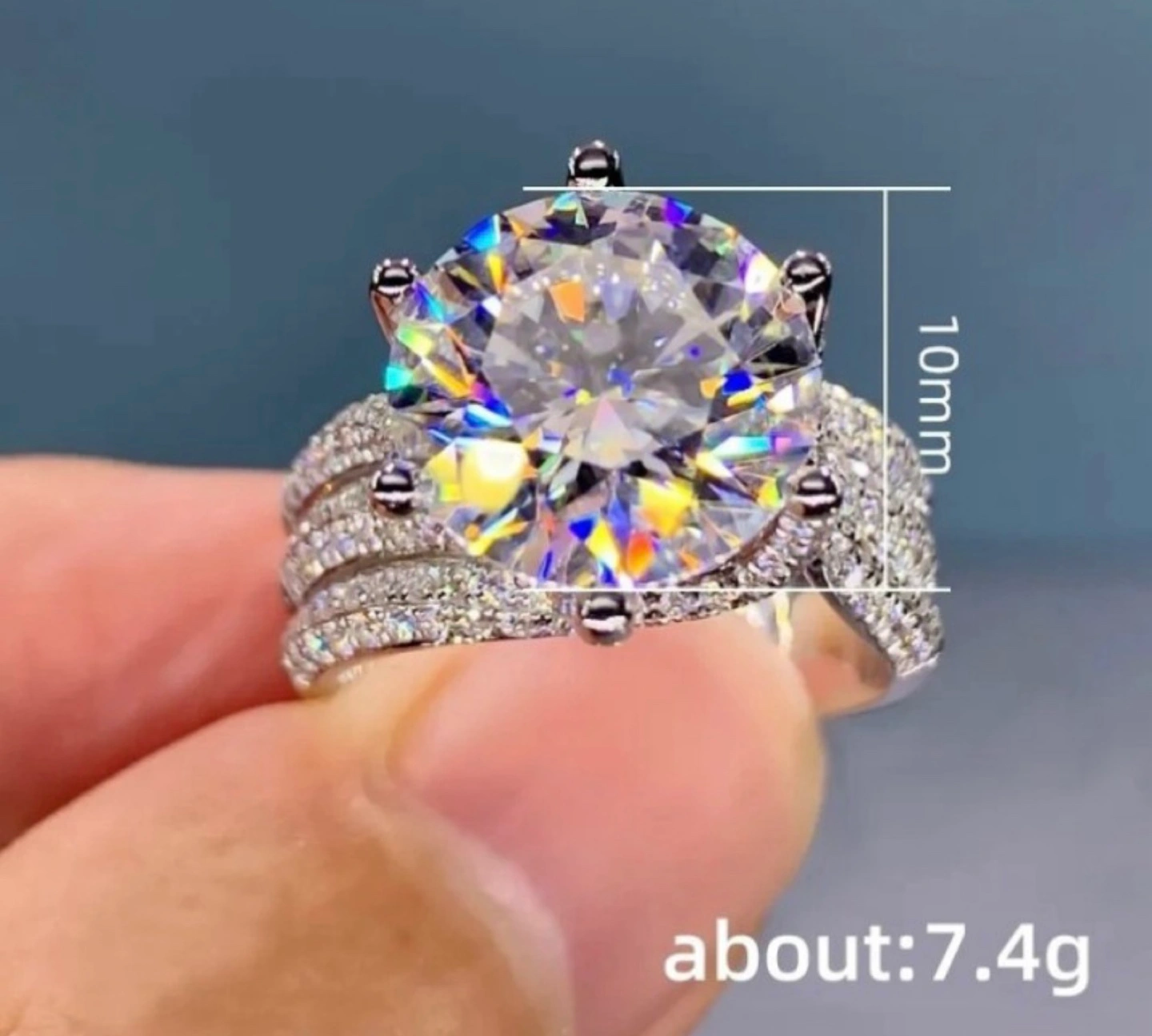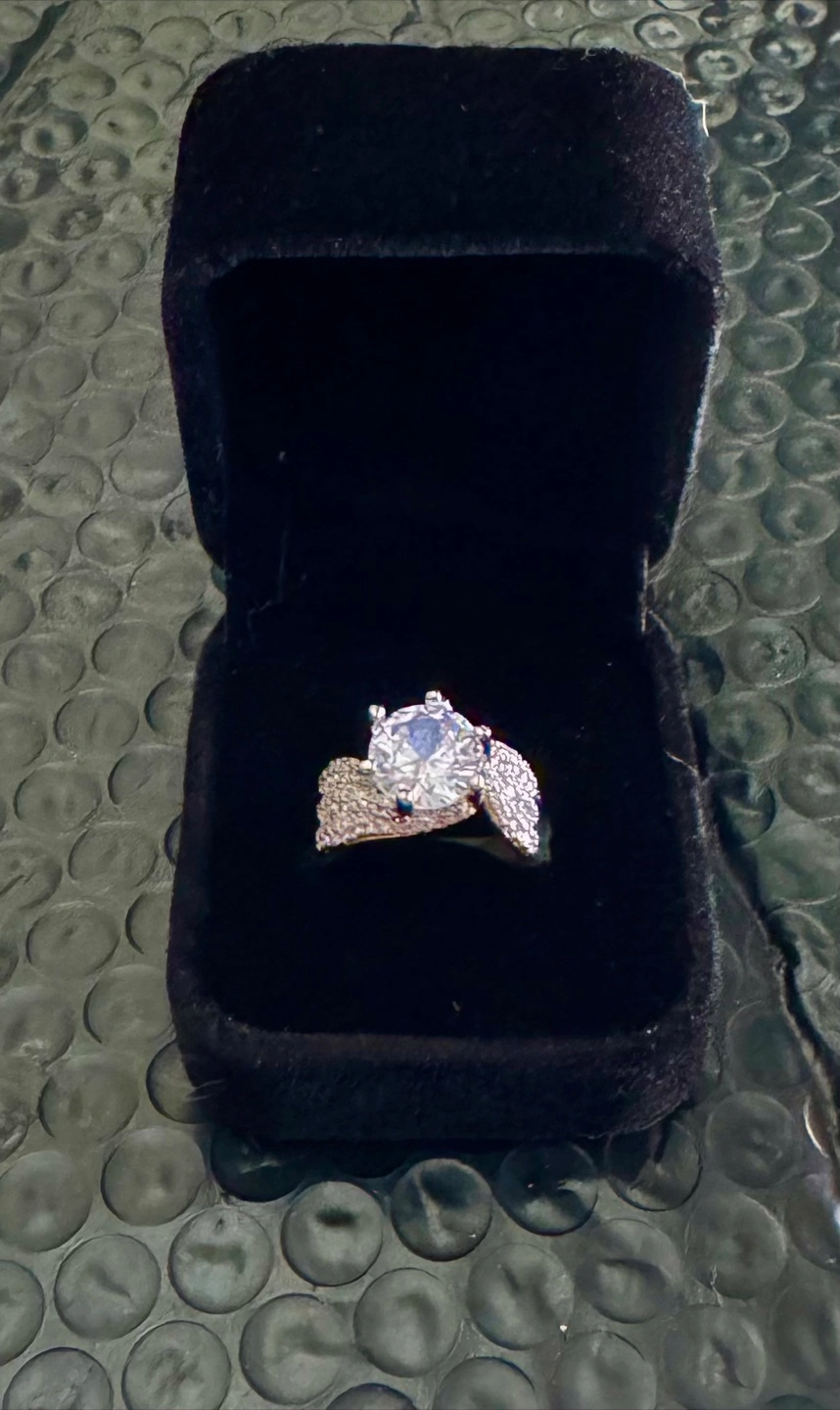 Selling a beautiful sterling silver moissanite ring featuring a large, round-cut stone. The ring has an intricate design with smaller stones accenting the band. It's in great condition and comes with a velvet box for safekeeping. The stone is approximately 10mm in height and the ring weighs about 7.4g