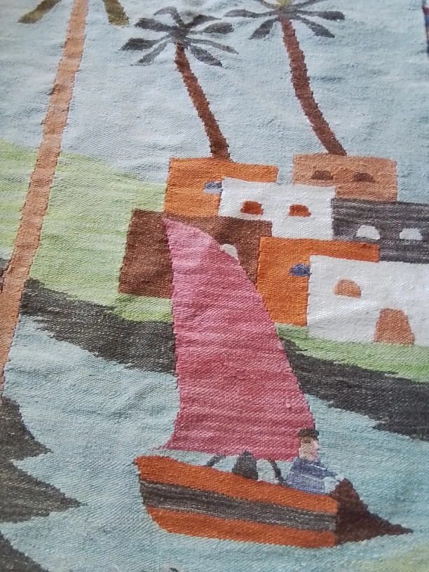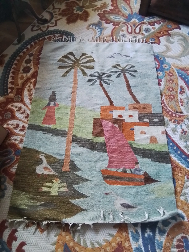 I am selling a vintage Egyptian handwoven wool rug that features a charming scene with palm trees, a sailboat, and figures, capturing a traditional Egyptian aesthetic. Being a used item, it adds a touch of history and authenticity to any space. Note the tassels are a bit sparse. This rug would make a great wall hanging.