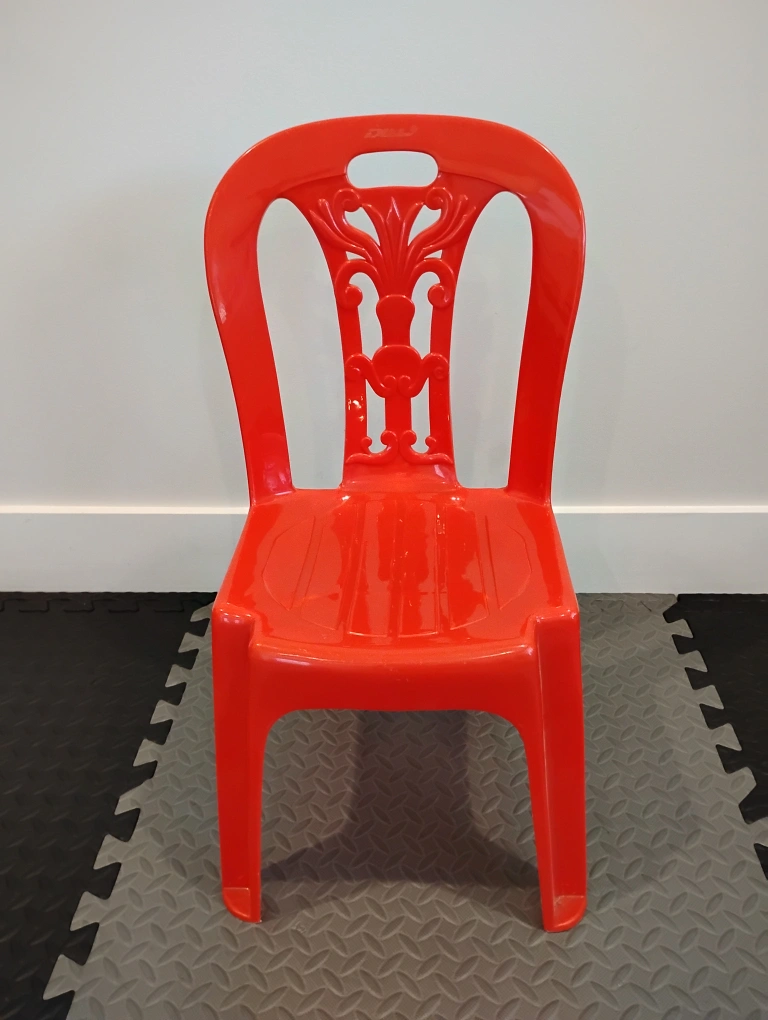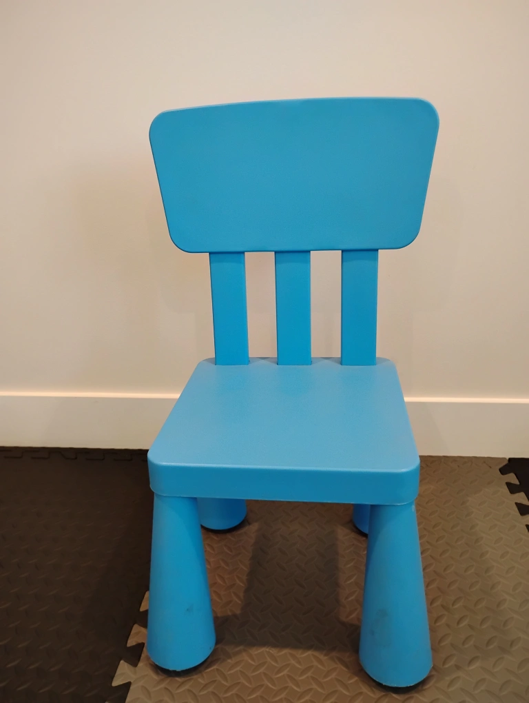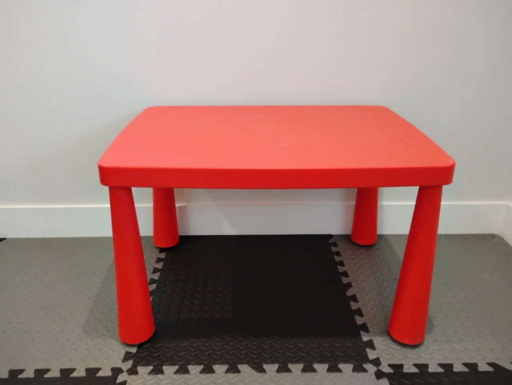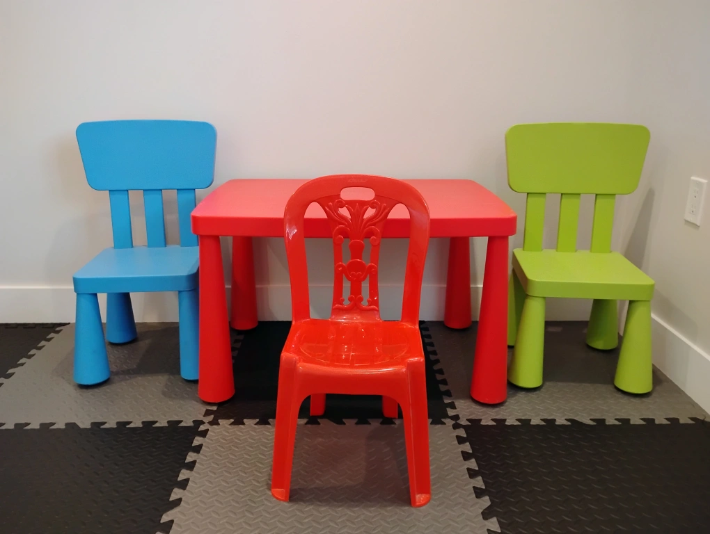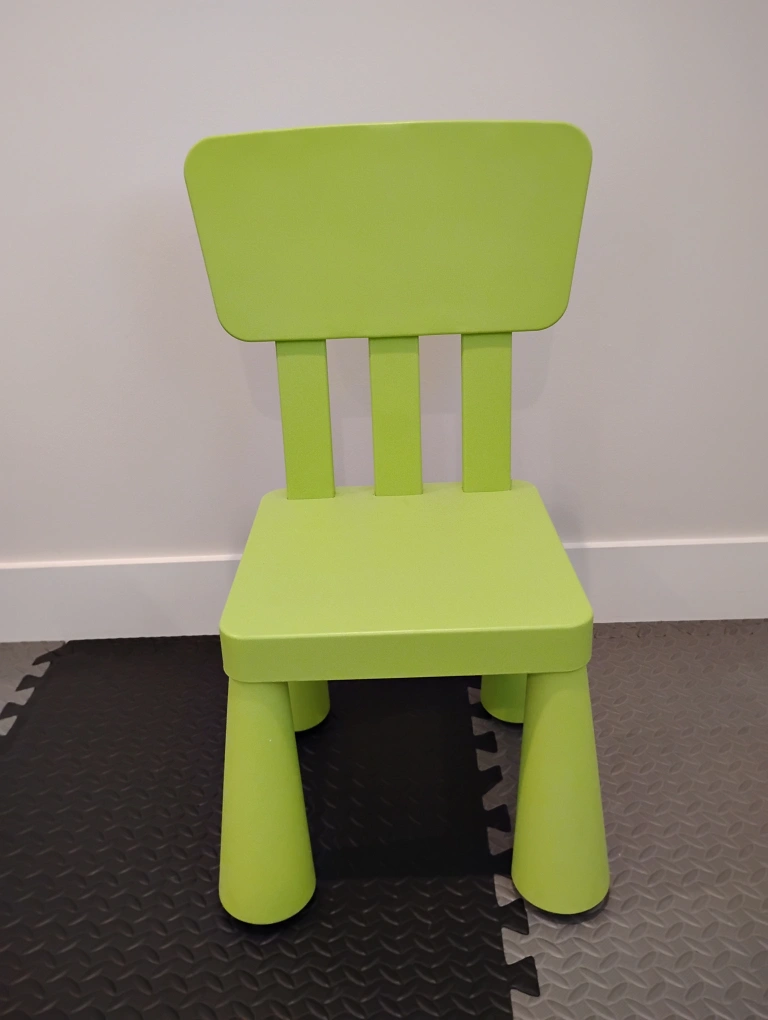 A colourful set of kids' plastic table and chairs. Perfect for playtime, crafts, or snacks. Includes one red table, one red chair, one blue chair, and one green chair. Great for a playroom or kids' room! New mammut chair at Ikea would be $25 each and new mammut table would be $45.
