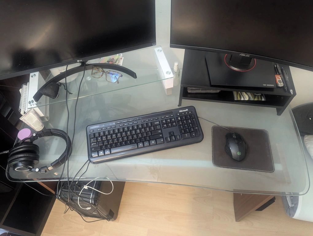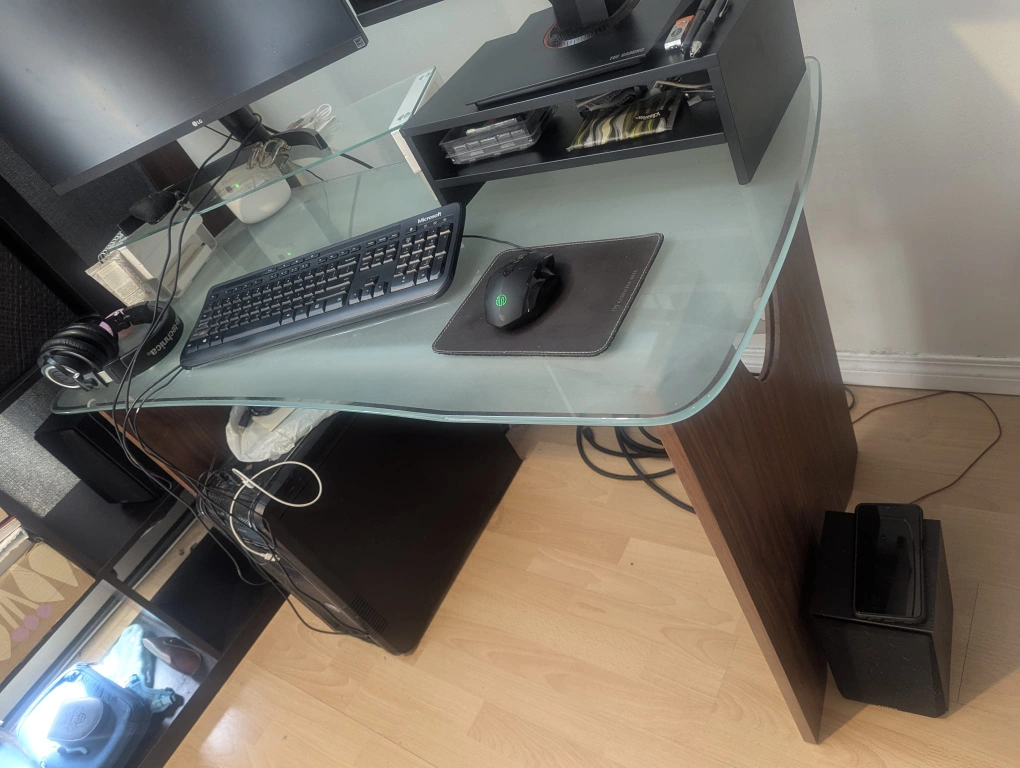 Selling a glass top desk. It's in good condition and has a sleek, modern look. Perfect for a home office or study space! It's a sturdy desk with a unique design. fully disassembles and includes the raisers if you want them