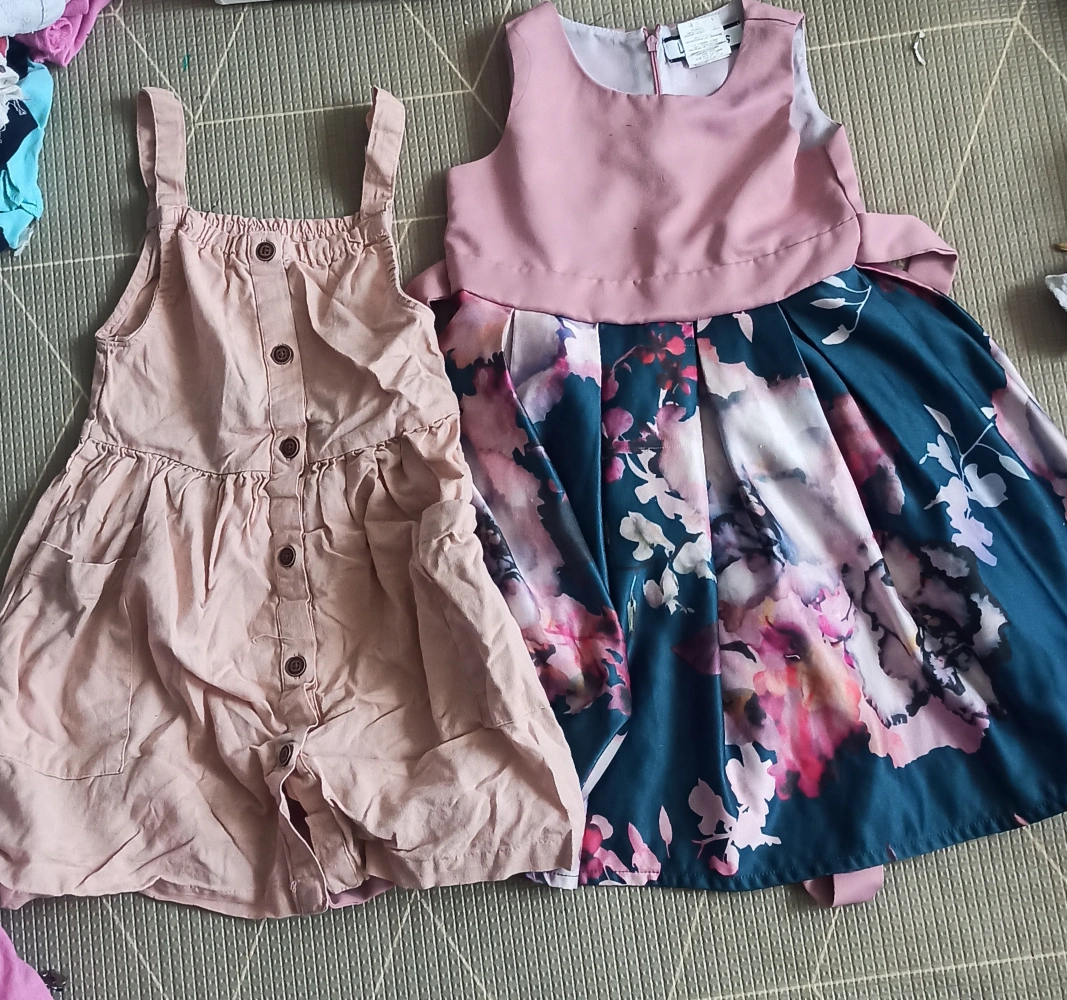 Two cute dresses for girls! One is a solid pink colour, and the other has a beautiful floral pattern on a teal background. Both are in great condition and ready for a new home. lightpink overall is cotton great for summer.