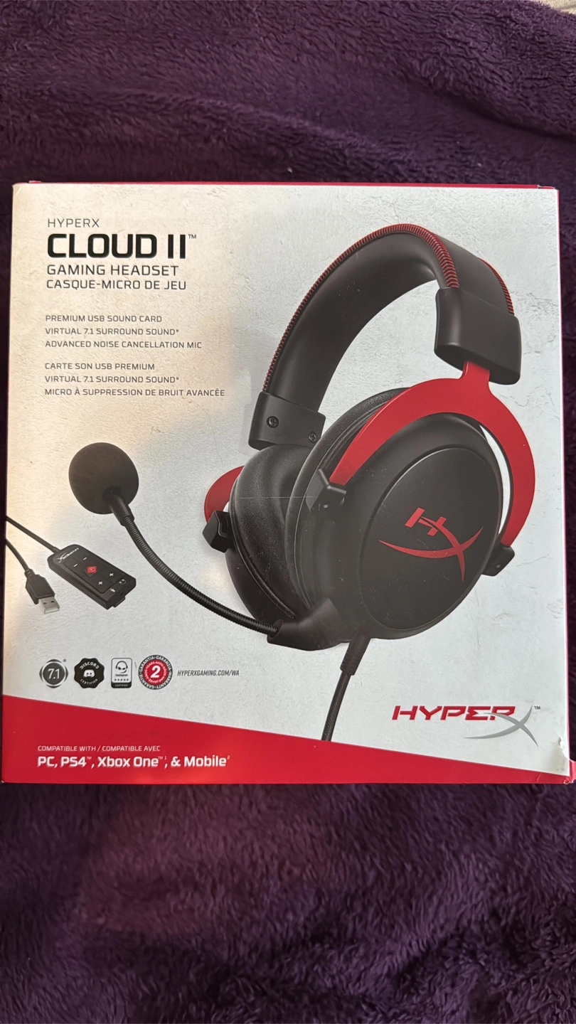Selling a HyperX Cloud II gaming headset in new condition! It comes with the original box and components, just missing one single extra leatherette ear pad, but is including the microphone and USB sound card. Perfect for PC, PS4, Xbox One, and mobile gaming!