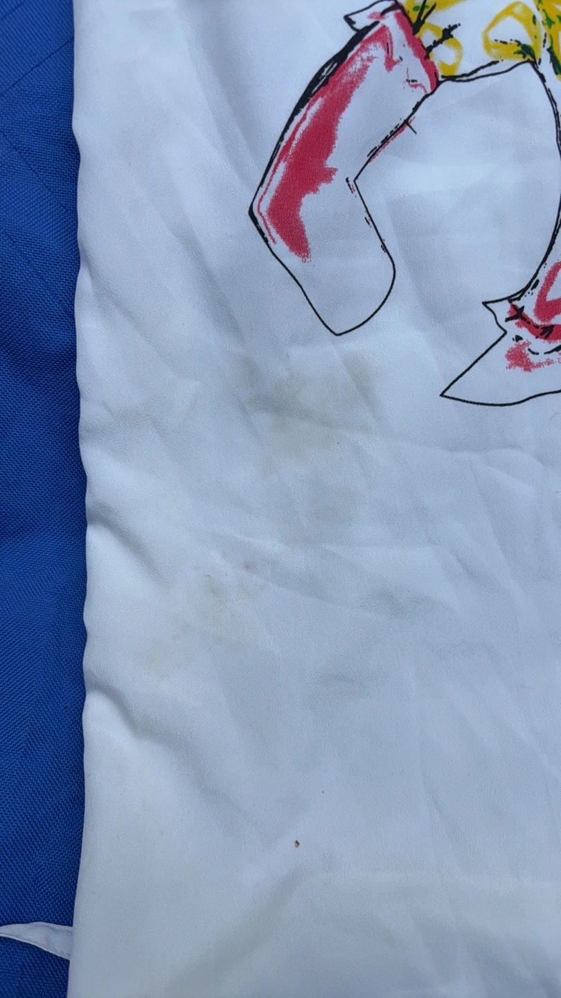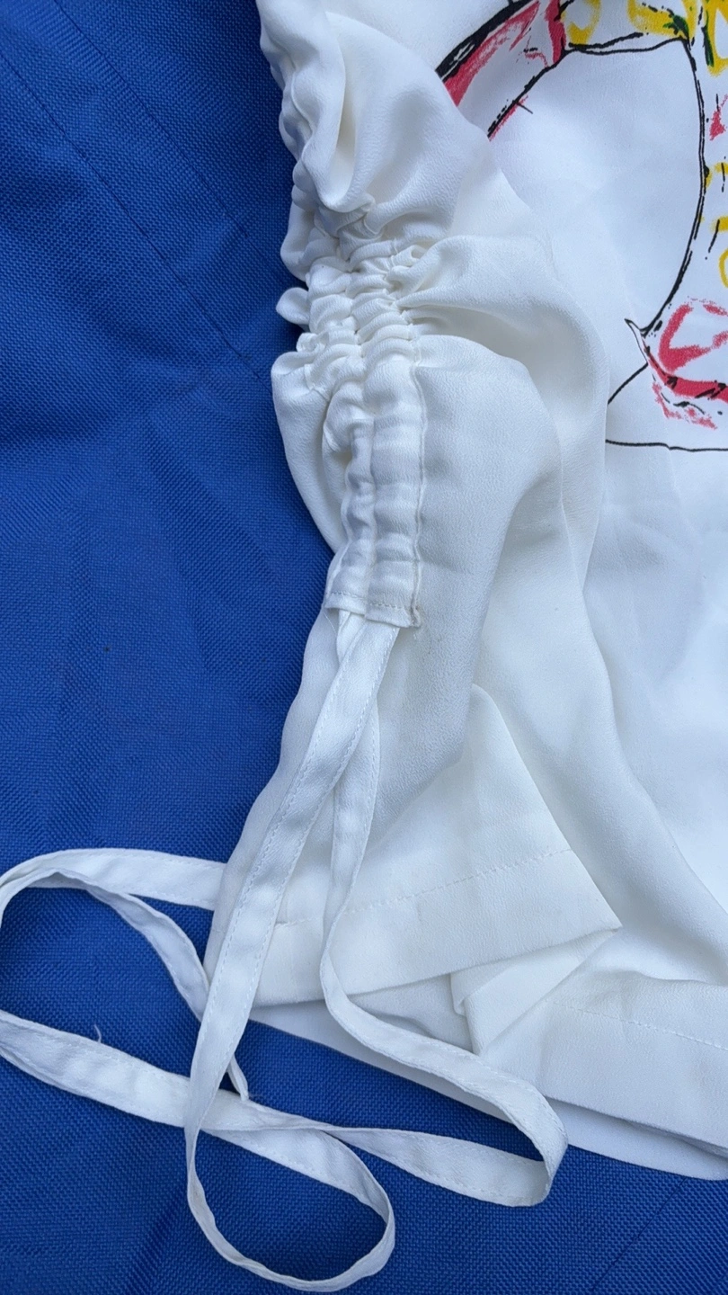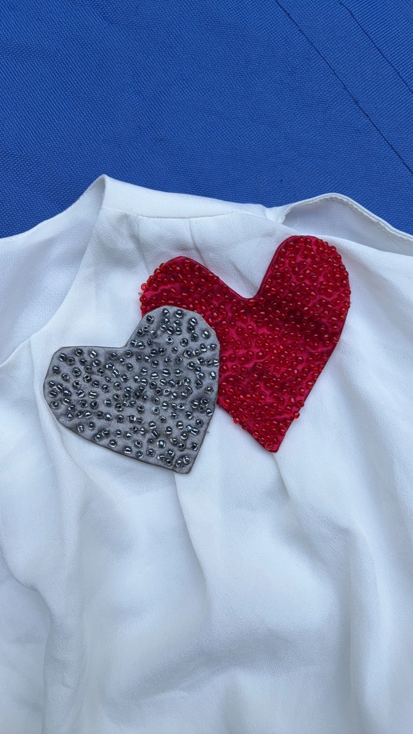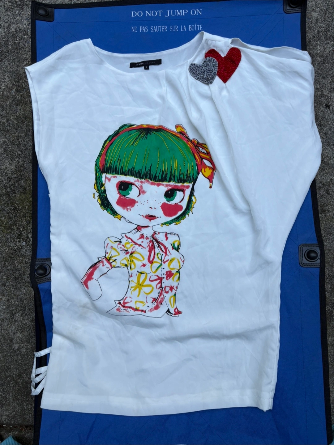 Selling a Marc Jacobs white top in size 2. It has a unique graphic design and cute heart embellishments. There are some small stains on the front.
