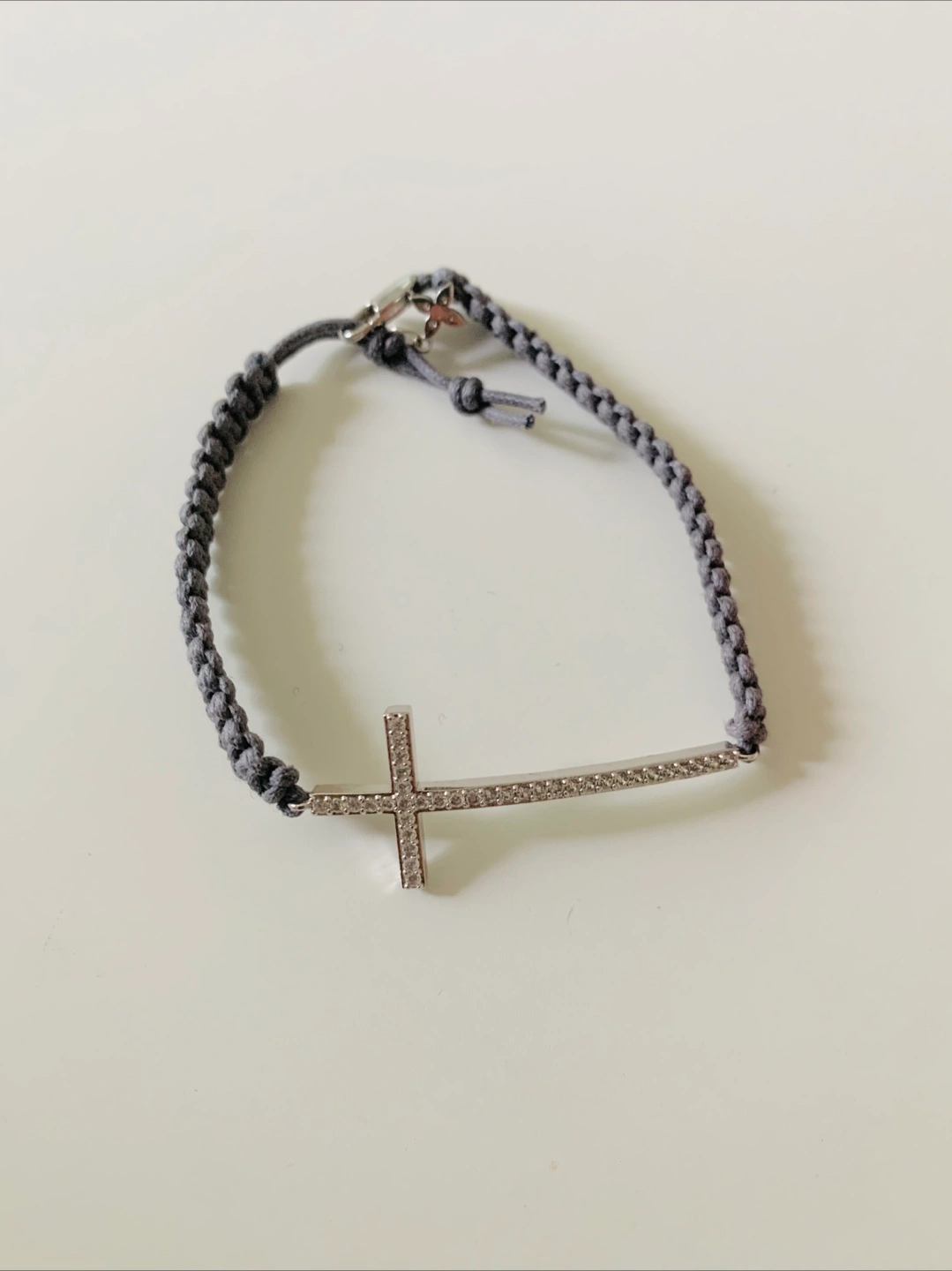 Selling a lovely cross bracelet! It features a silver-coloured cross design, perfect for adding a touch of elegance to any outfit. The bracelet has a grey braided band with an adjustable closure for a comfortable fit. It's in great condition and ready for a new home
