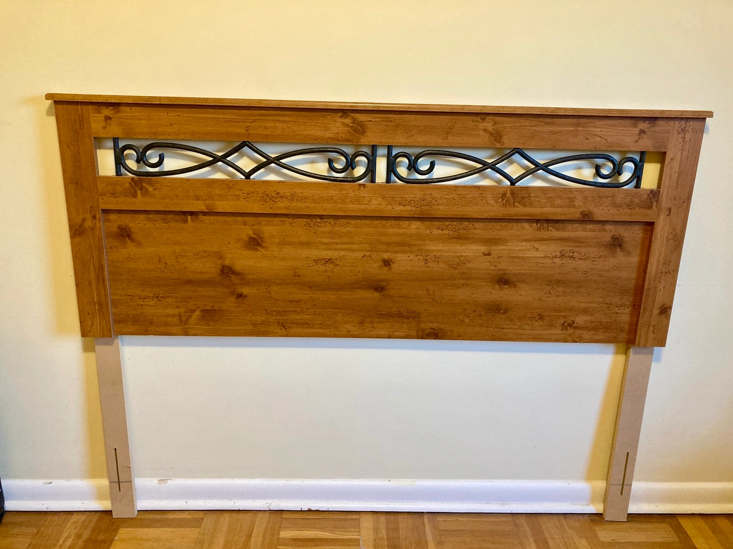 Selling a lovely wooden headboard with decorative metal detailing. Would add a touch of rustic charm to any bedroom!