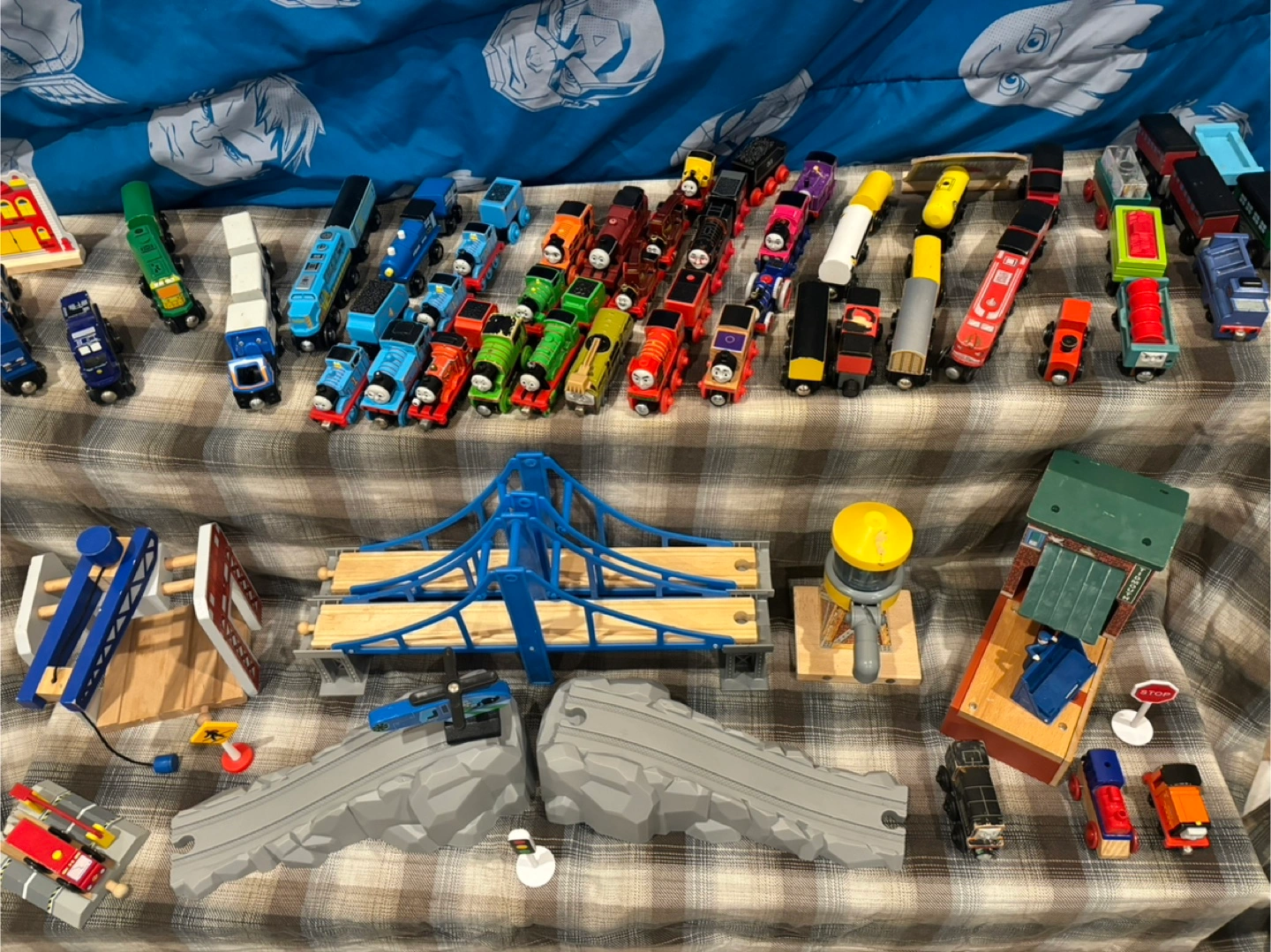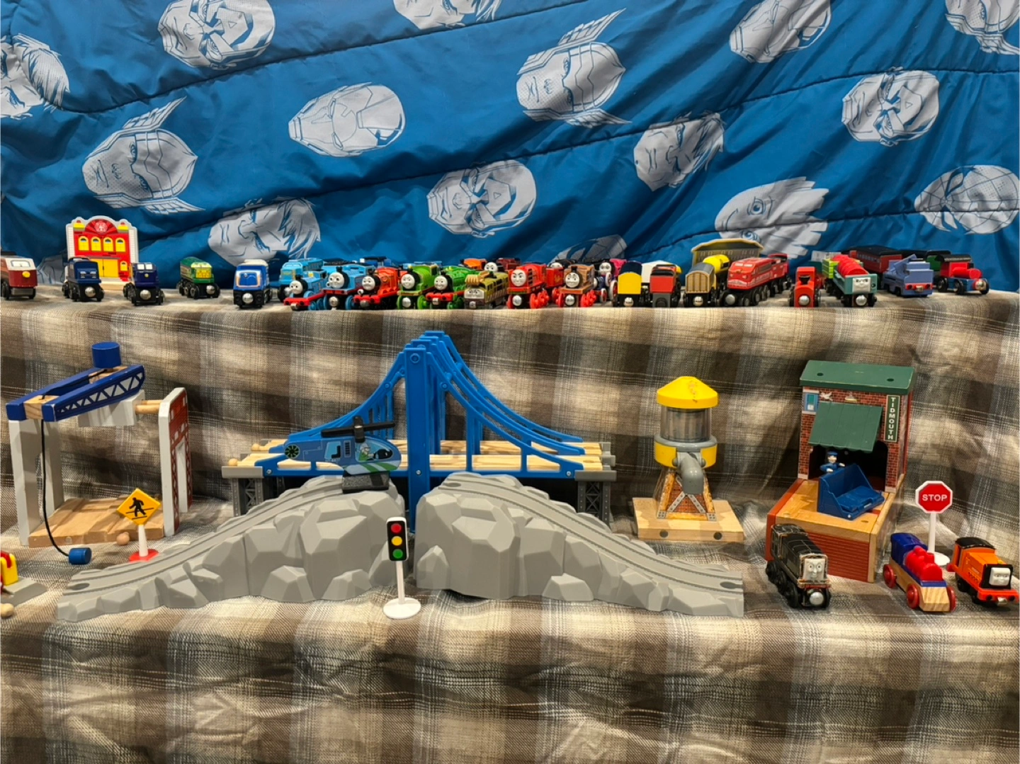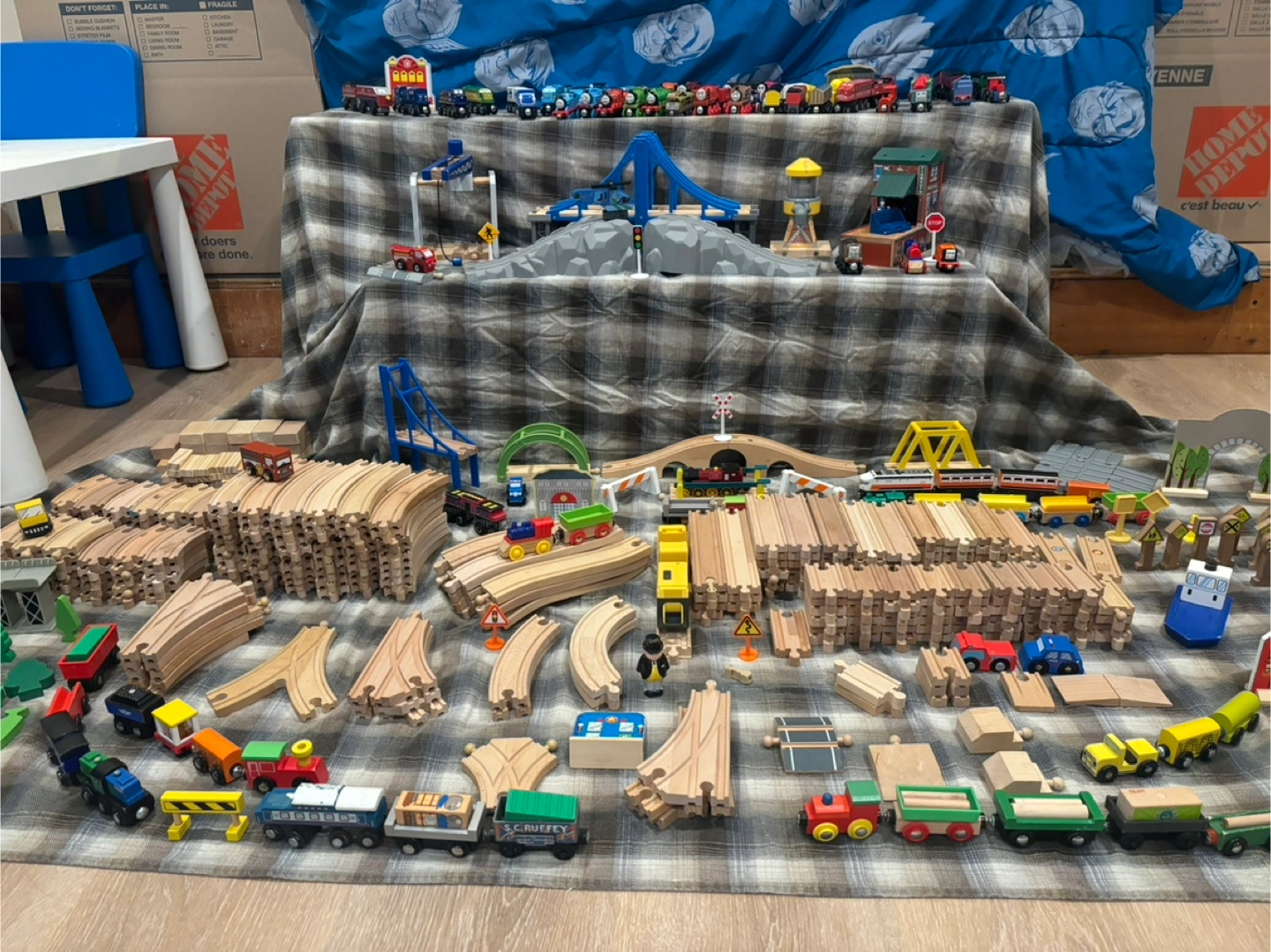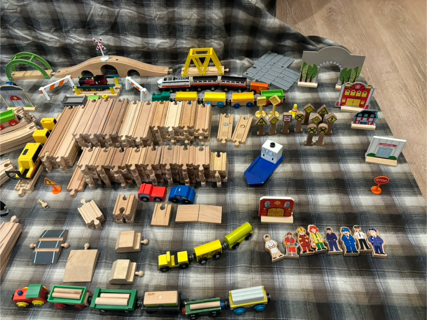 Huge wooden train set with lots of tracks, trains, figures, and accessories! Hours of fun for kids who love trains and building things. Over 400 pieces of track plus so much more