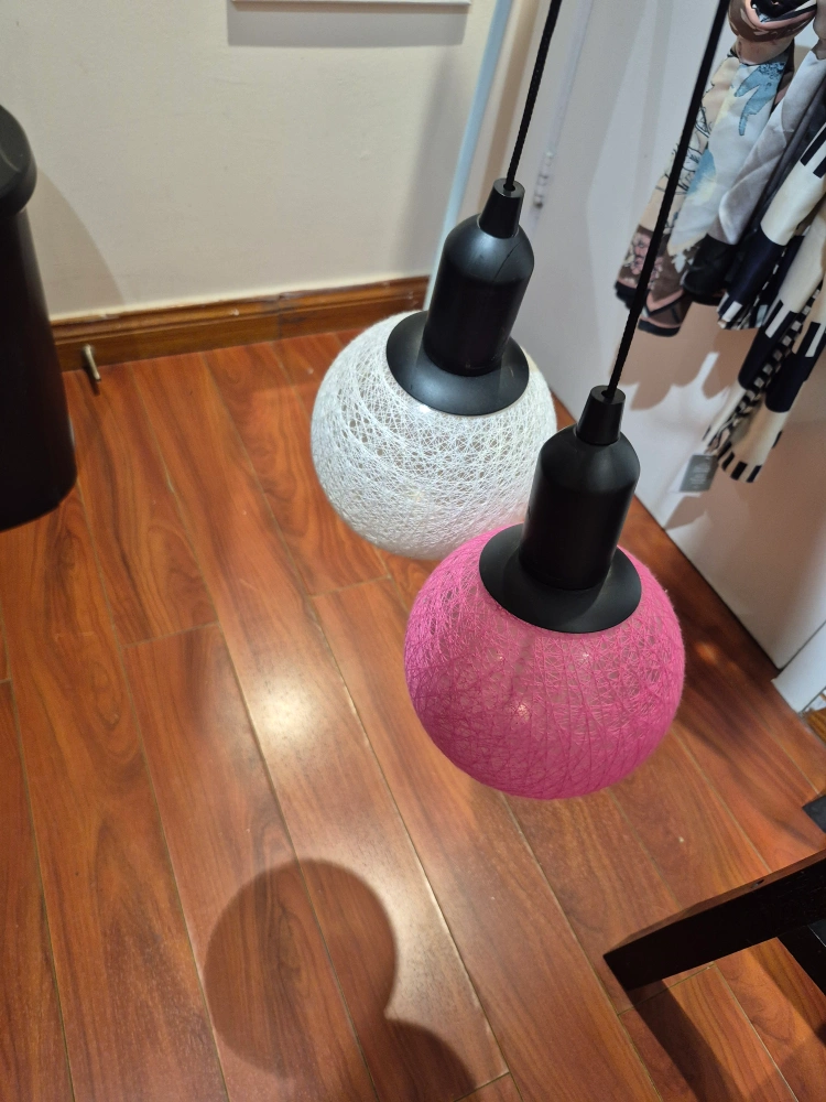 Selling a set of two pendant lights! One is a lovely pink colour and the other is white. They're in great condition and would add a fun touch to any room, need 3 x AAA batteries each pretty cute, strings approximately 3m long
