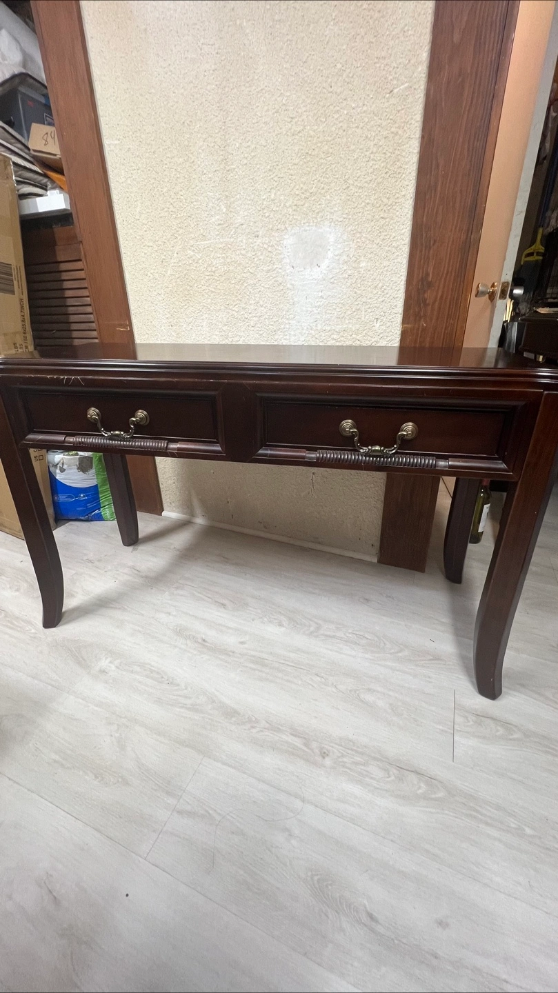 Selling a dark brown console table! It features two drawers with antique-style handles. Perfect for an entryway or hallway