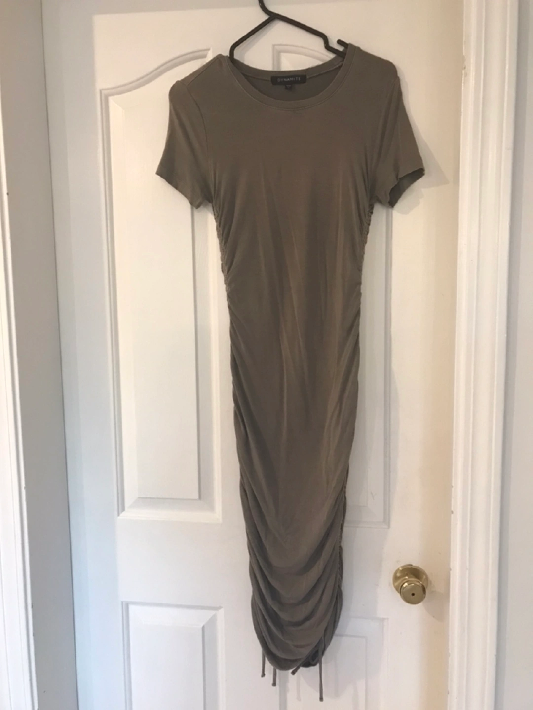 Olive Dynamite ruched dress in size XS. Length is 44”. The length is adjustable on sides. Very comfortable fabric.