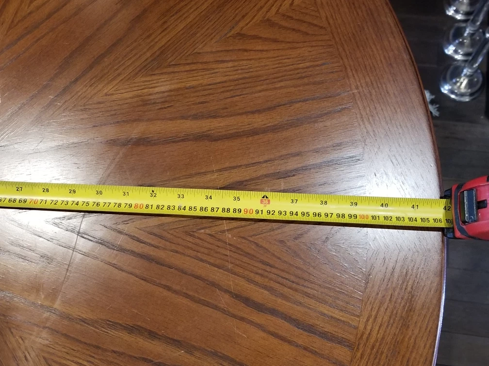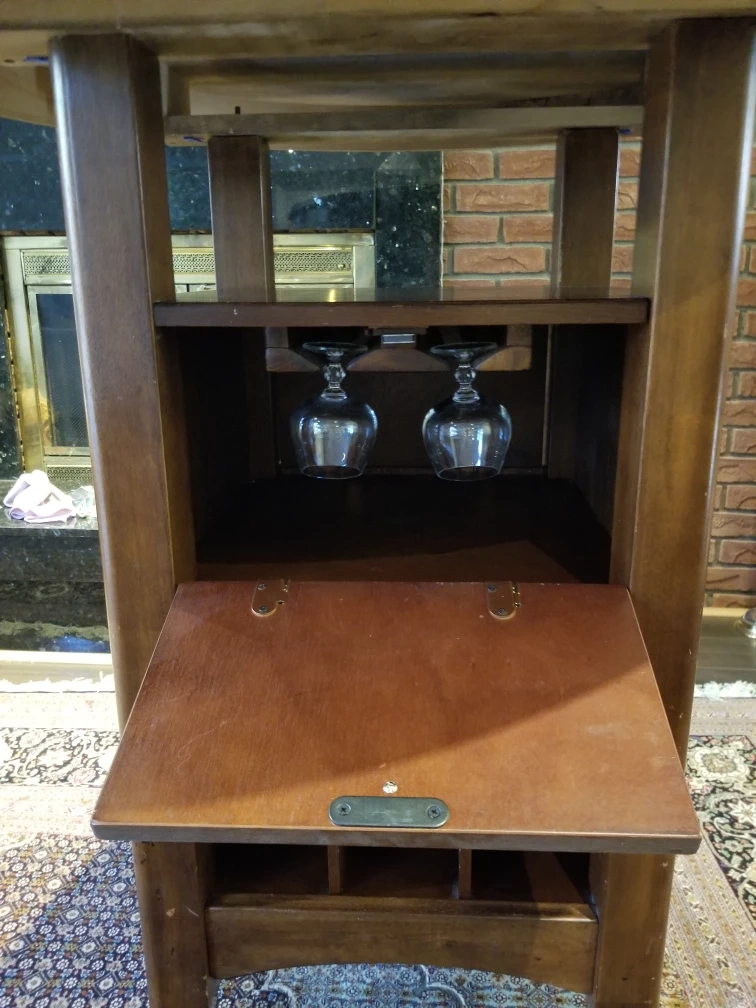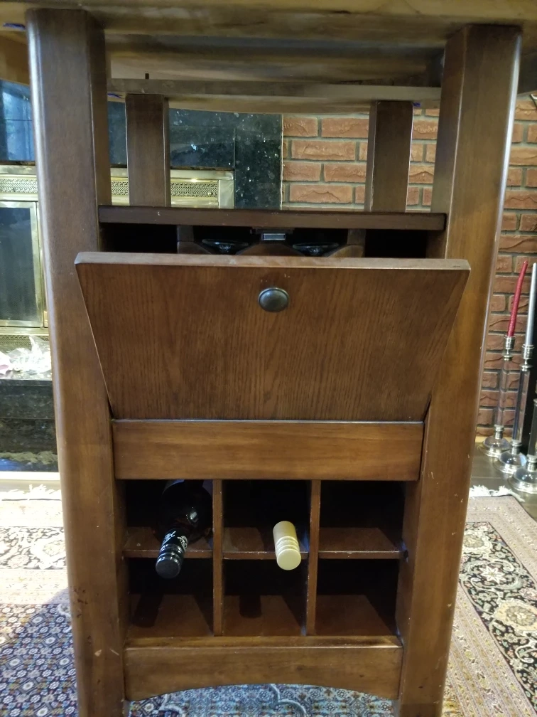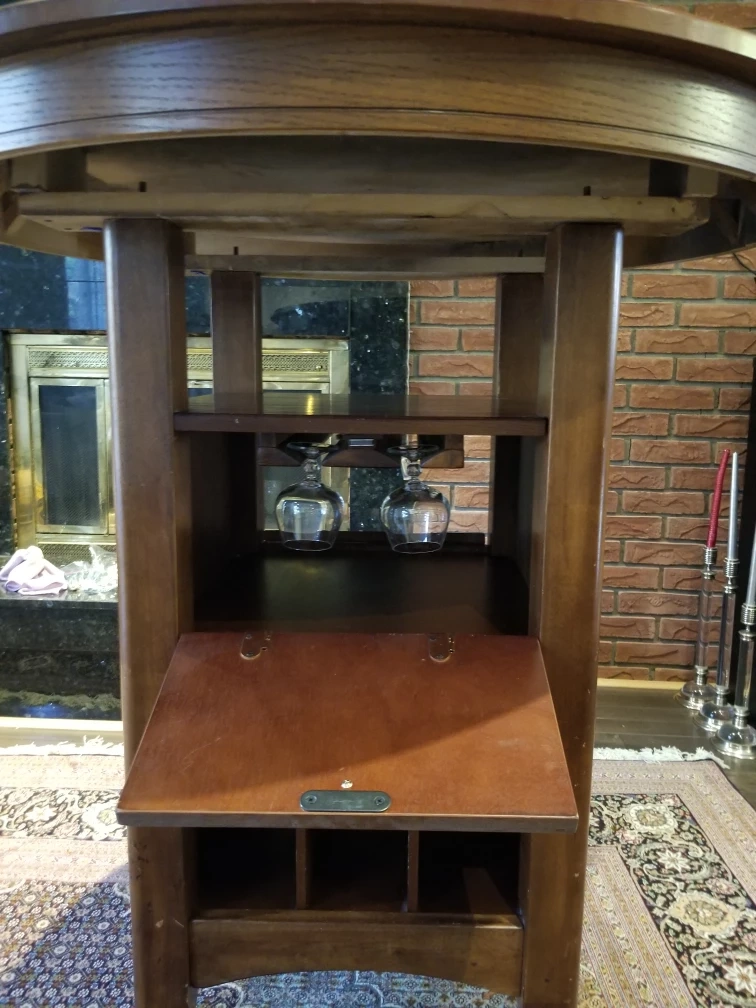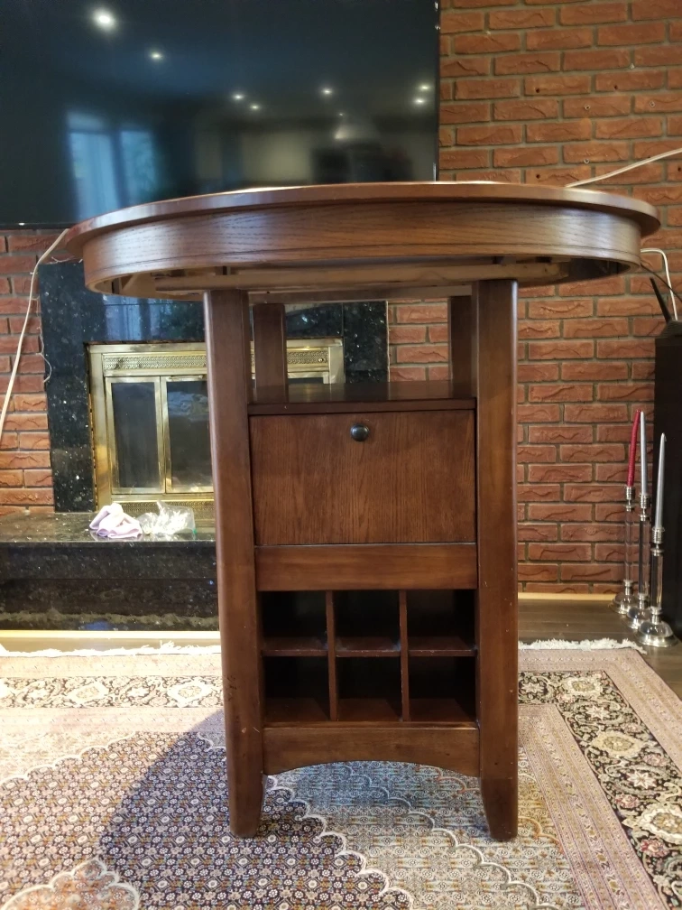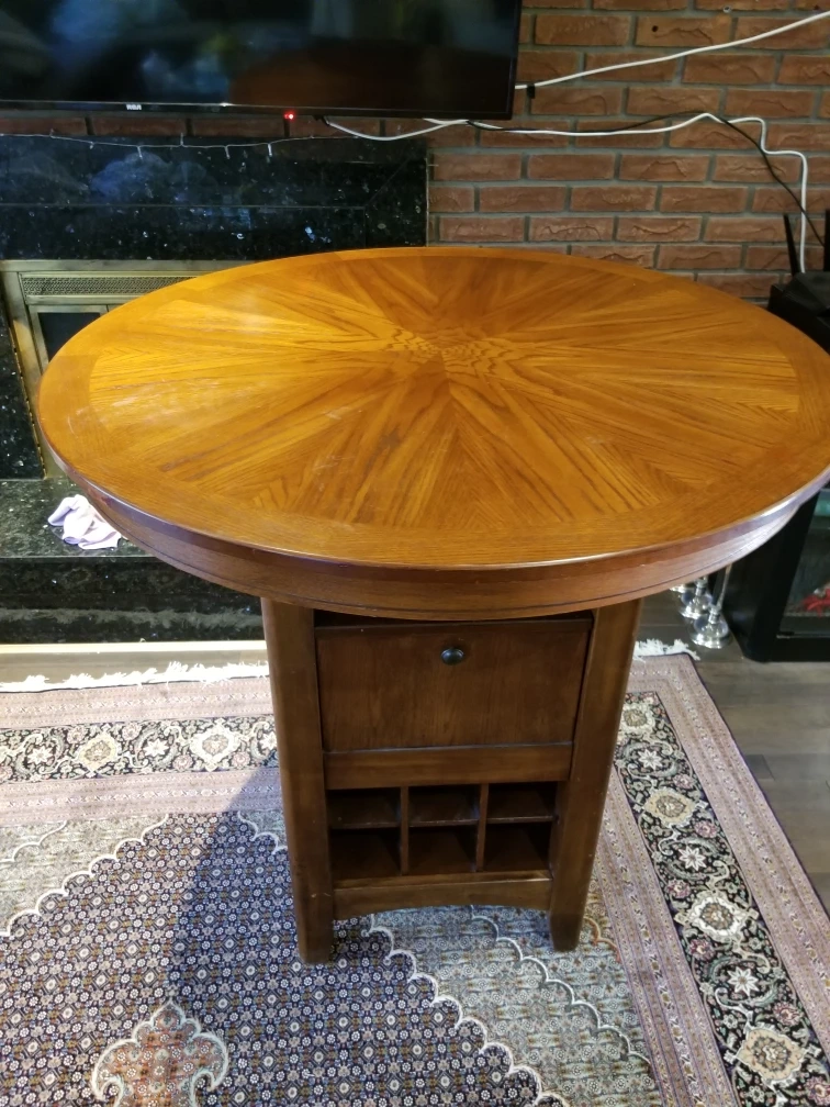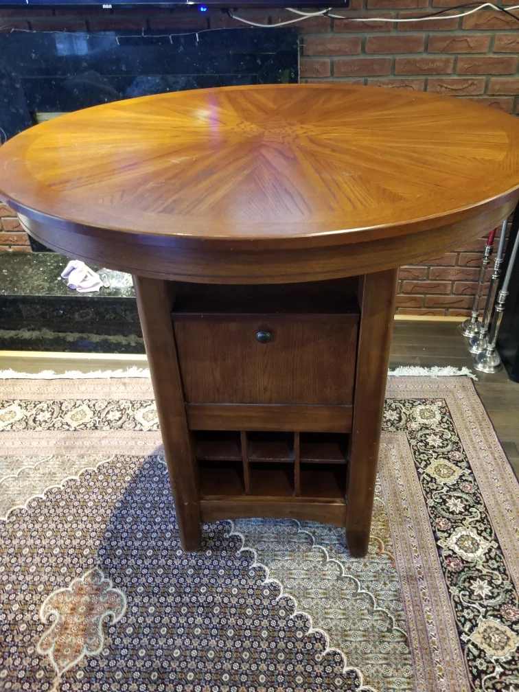Selling a round wooden bar table. It's in great shape and features a convenient wine rack underneath the tabletop. The table's diameter is approximately 42 inches.