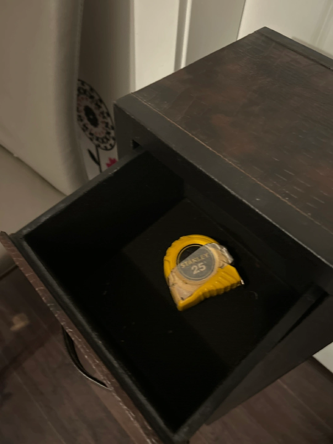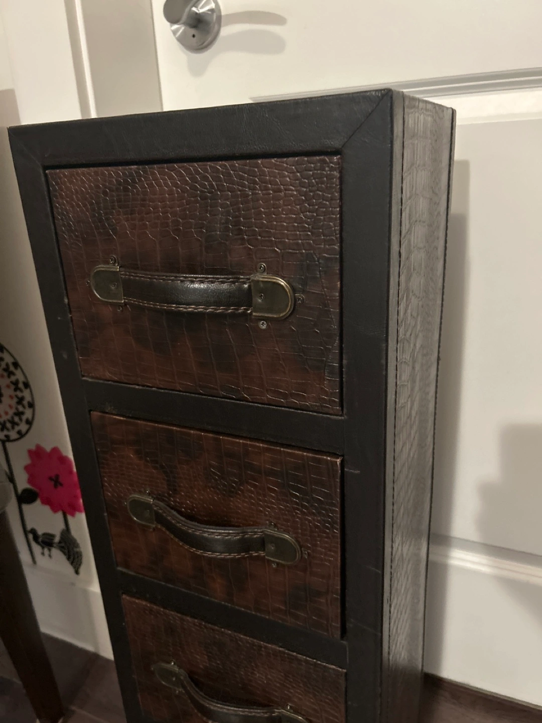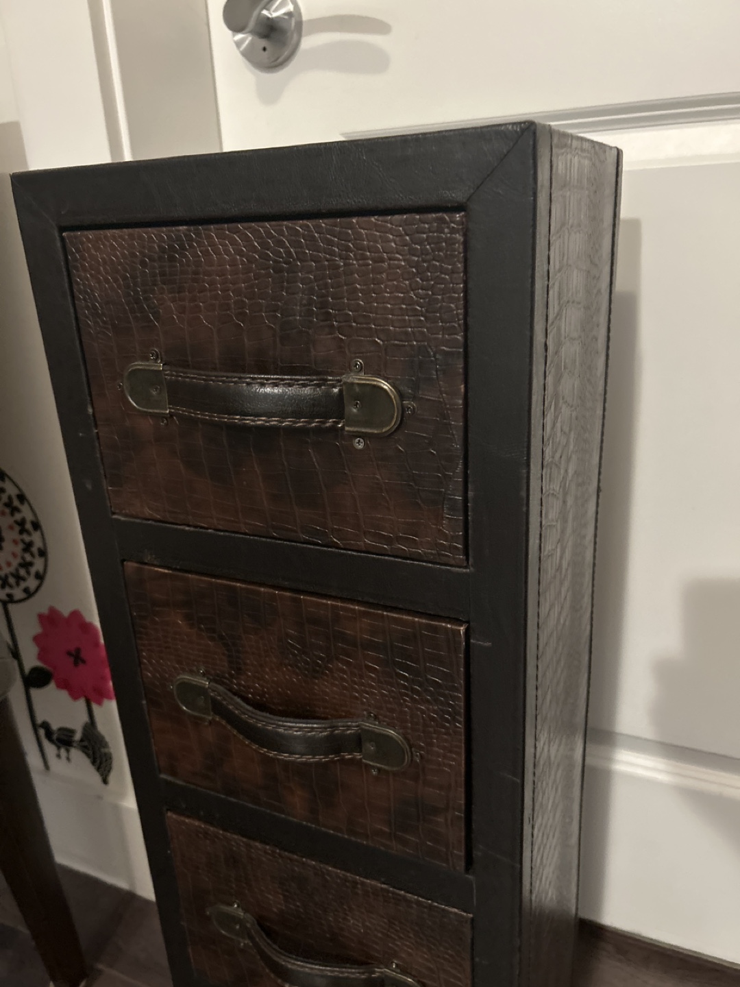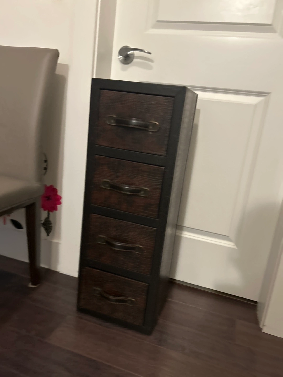 This is a cute little cabinet with four drawers! It has a dark brown finish and metal hardware. Perfect for small spaces or extra storage in any room