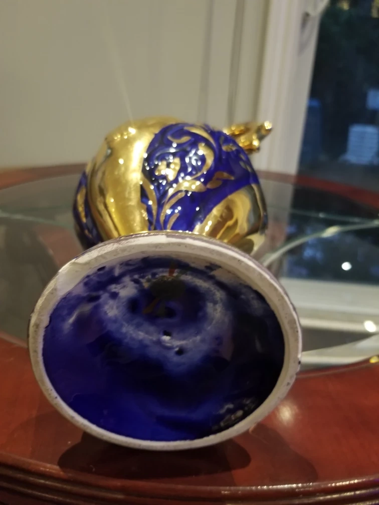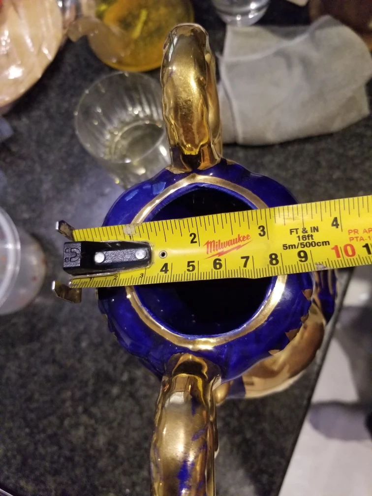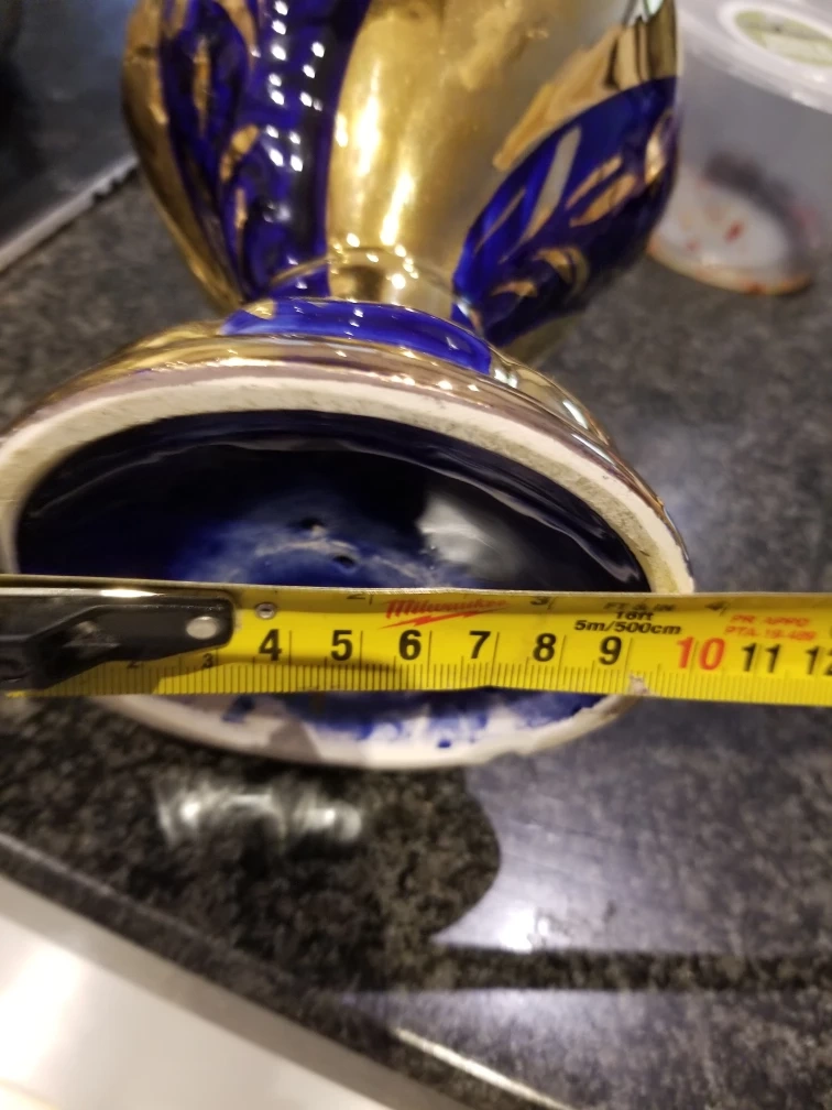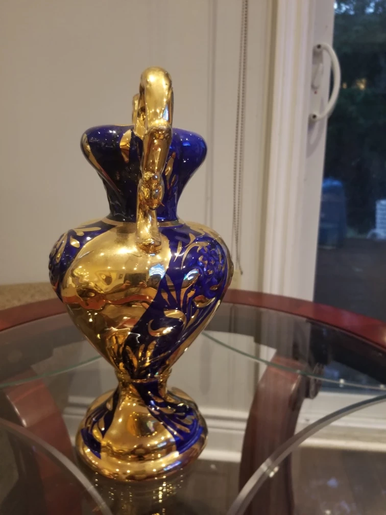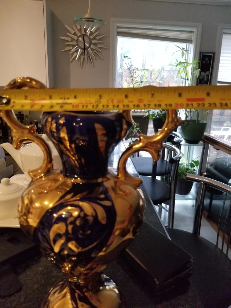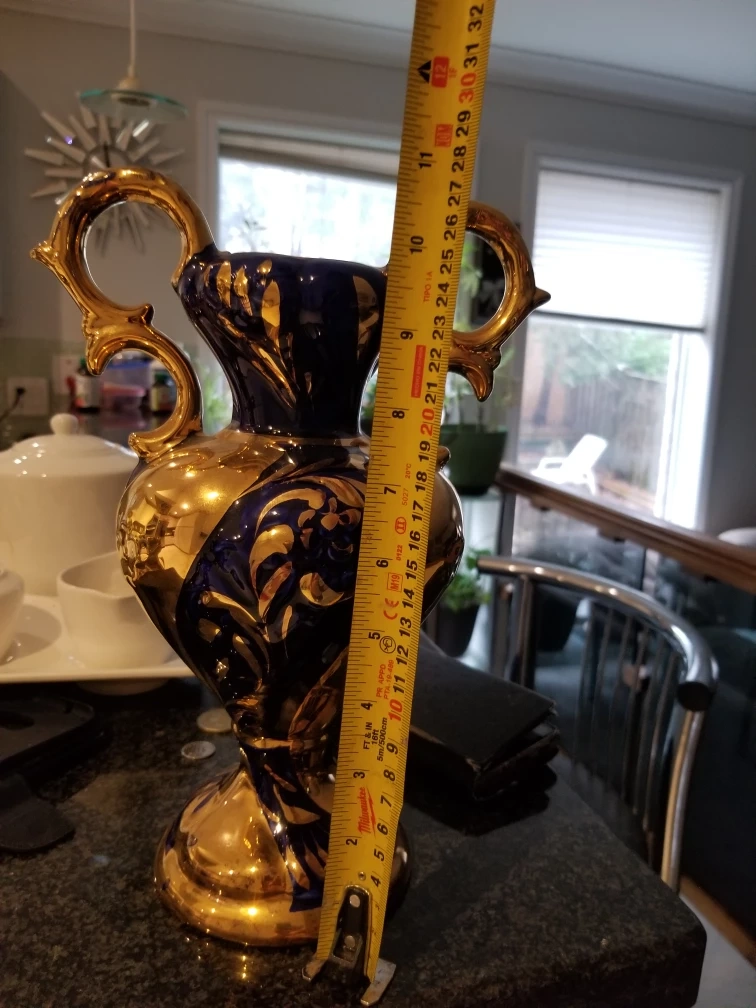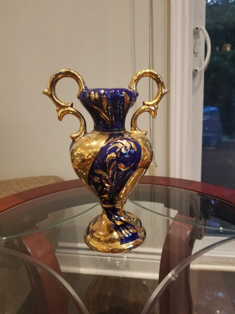 Beautiful, vintage decorative vase featuring a striking combination of gold and blue. It stands approximately 12 inches tall and has a base diameter of around 5 inches. A lovely piece to add a touch of elegance to your home!