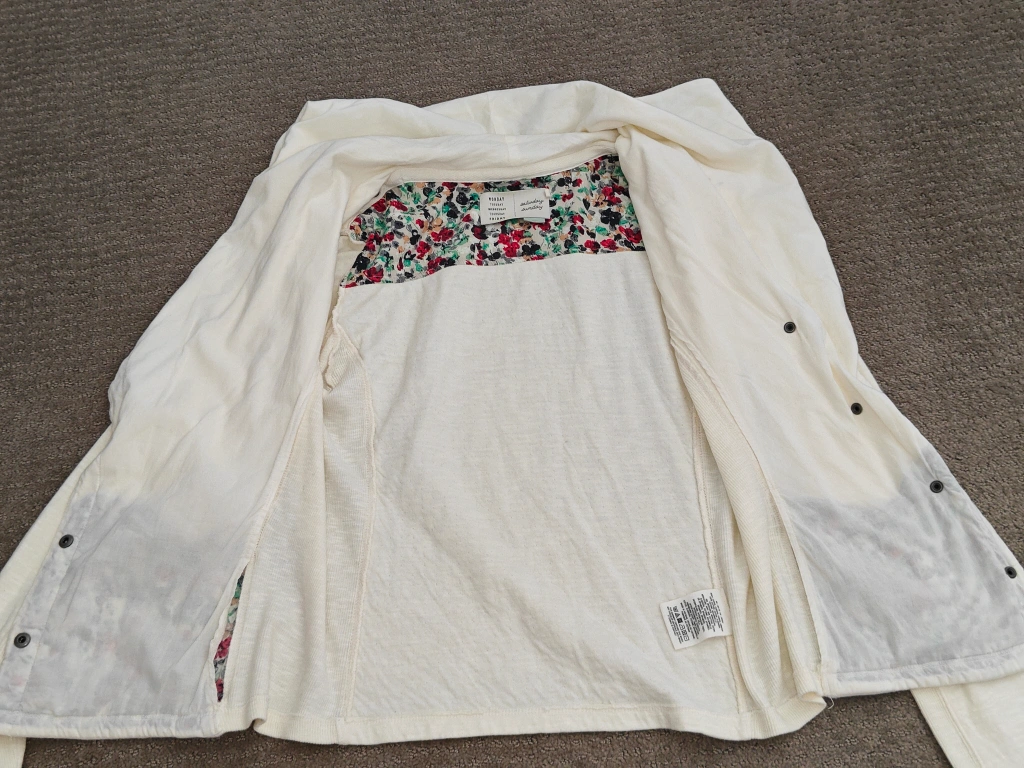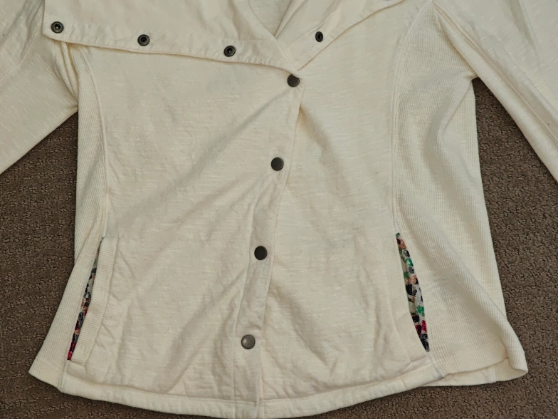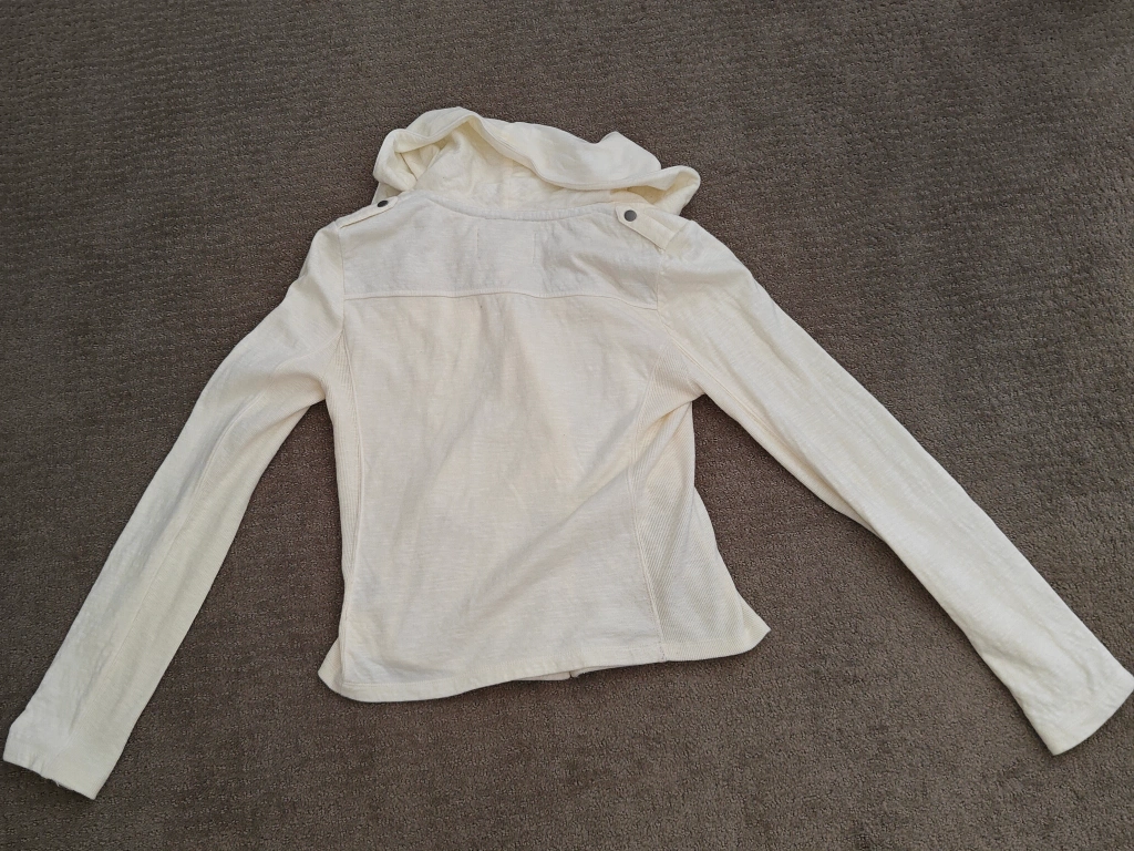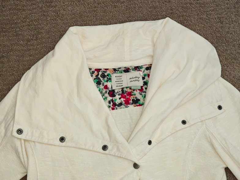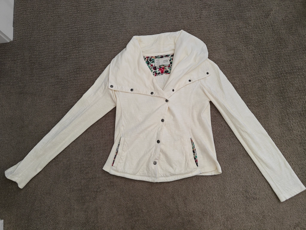174I am selling an Anthropologie Saturday Sunday Moto Sweatshirt Jacket with Diagonal Button Snaps and Oversized Collar in used, great condition. No rips, holes, or stains. Size: Small Colour: Off White Material: * Body: 100% Cotton * Rib: 98% Cotton, 2% Spandex * Interfacing: 100% Cotton Comes from a pet and smoke-free environment. Pickup in Mount Pleasant (NW Calgary)