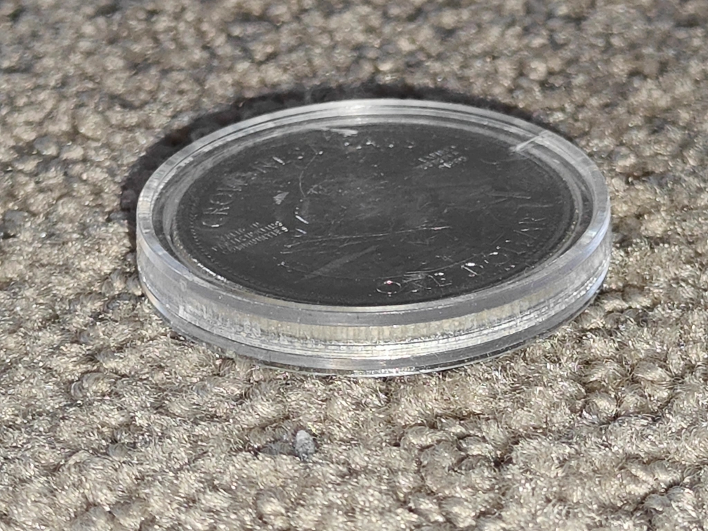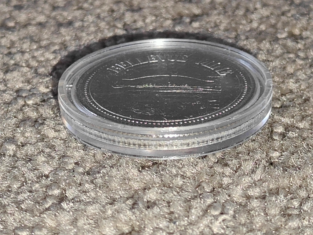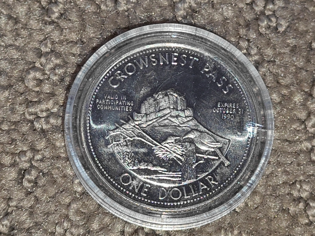 I am selling a Bellevue Mine - Crowsnest Pass - Trade Dollar Collector Token Coin in excellent vintage condition. The coin is capsulated. Has the writing on the back: "Valid in participating communities" and "Expires October 31 1990" and "One Dollar". Perfect addition to any Canadian coin collection.
