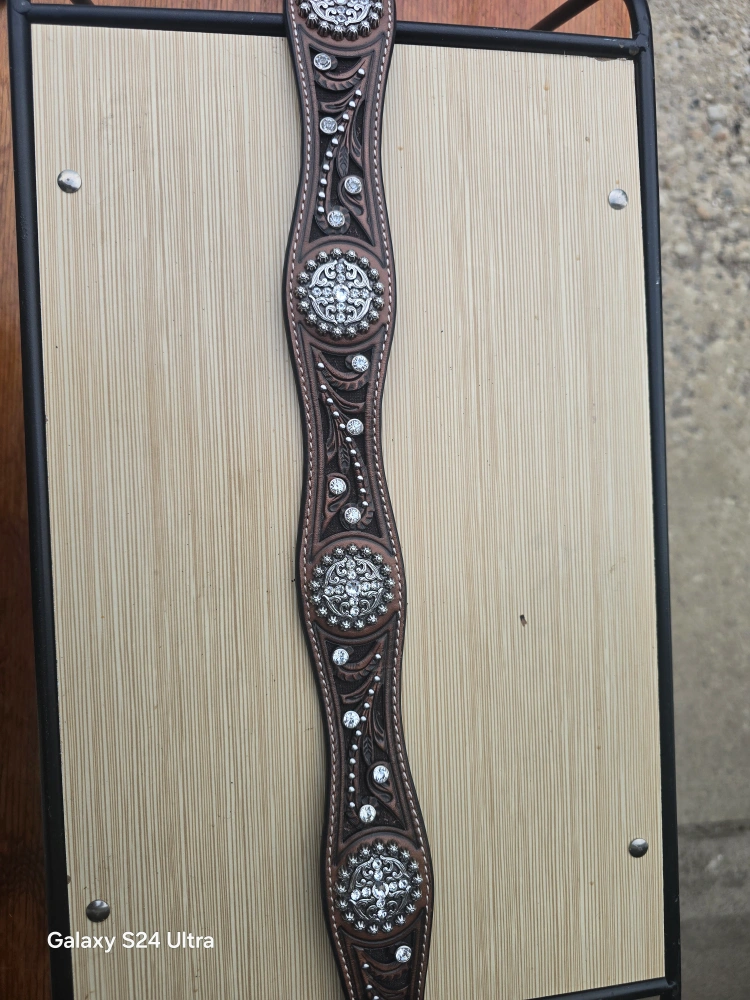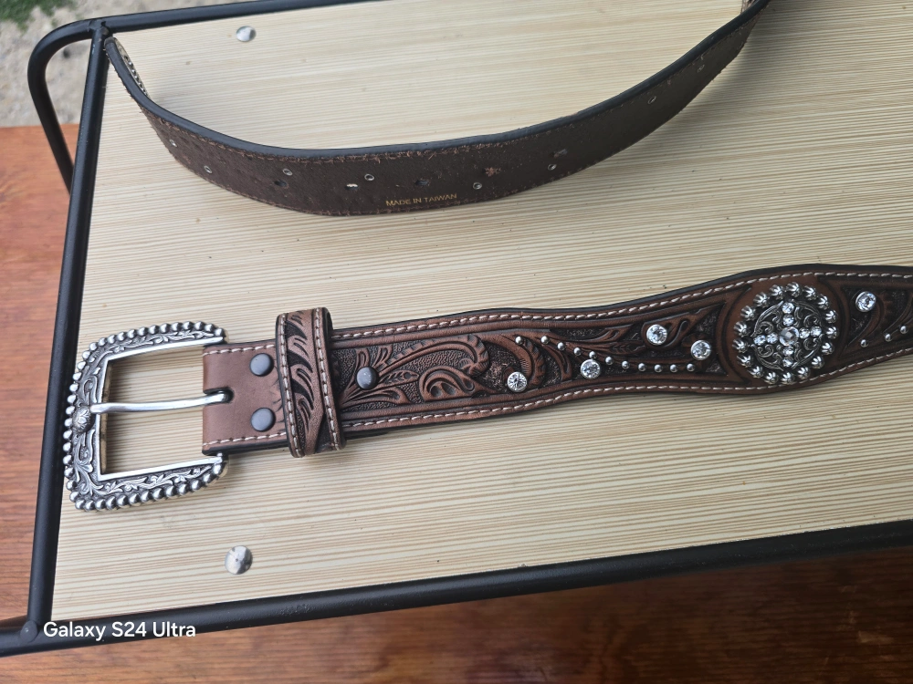 Selling a beautiful western belt with rhinestone detailing! It's in great condition and would be perfect for adding a bit of sparkle to any outfit. The belt features intricate floral designs and shiny rhinestones. It's a great accessory for a country-western look or just to add some flair to your everyday style