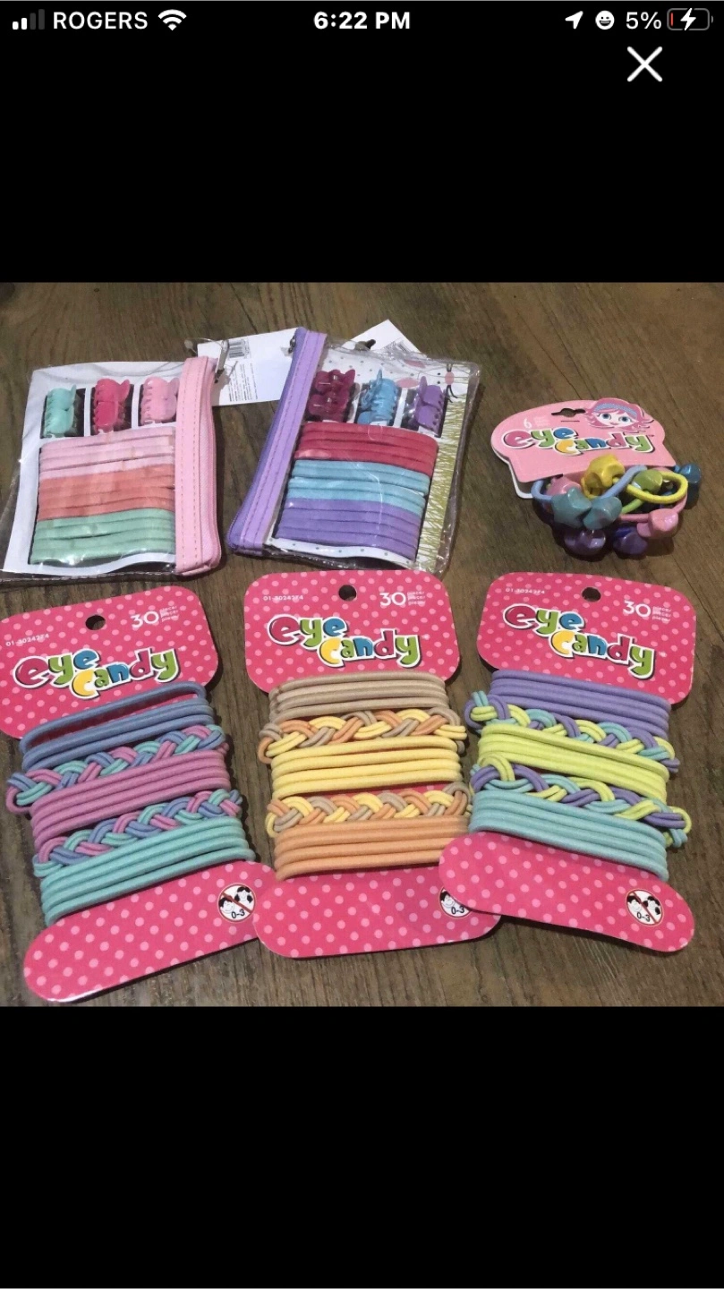 Selling new Eye Candy hair accessories! Includes hair ties and clips in various colours. Perfect for kids!