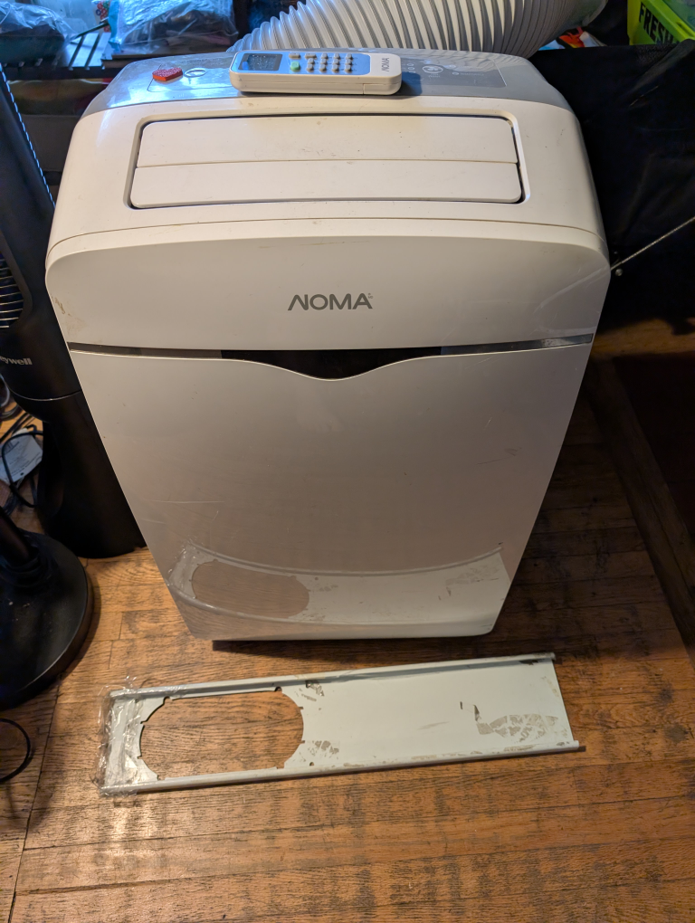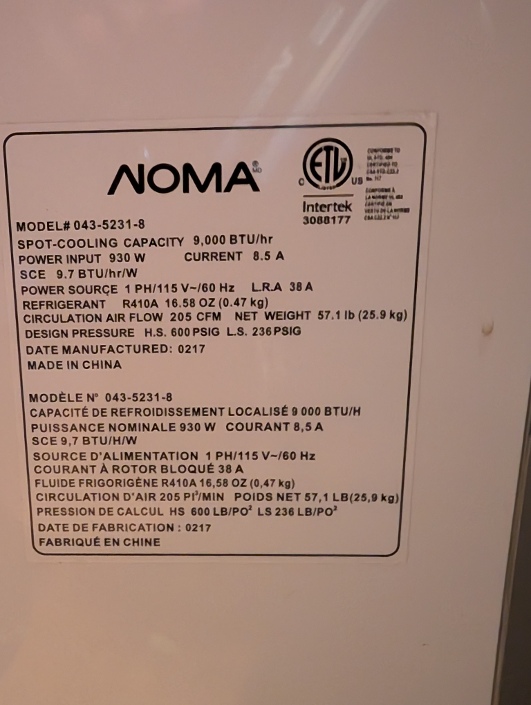 Selling a NOMA portable air conditioner. It has a spot-cooling capacity of 9,000 BTU/hr. The model number is 043-5231-8. It's in used condition, so please check the photos for details