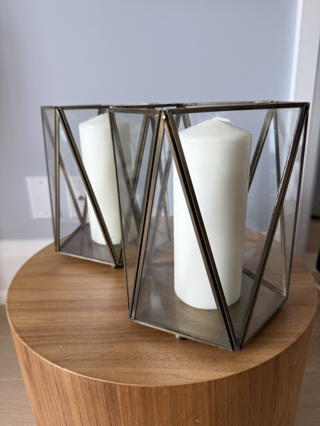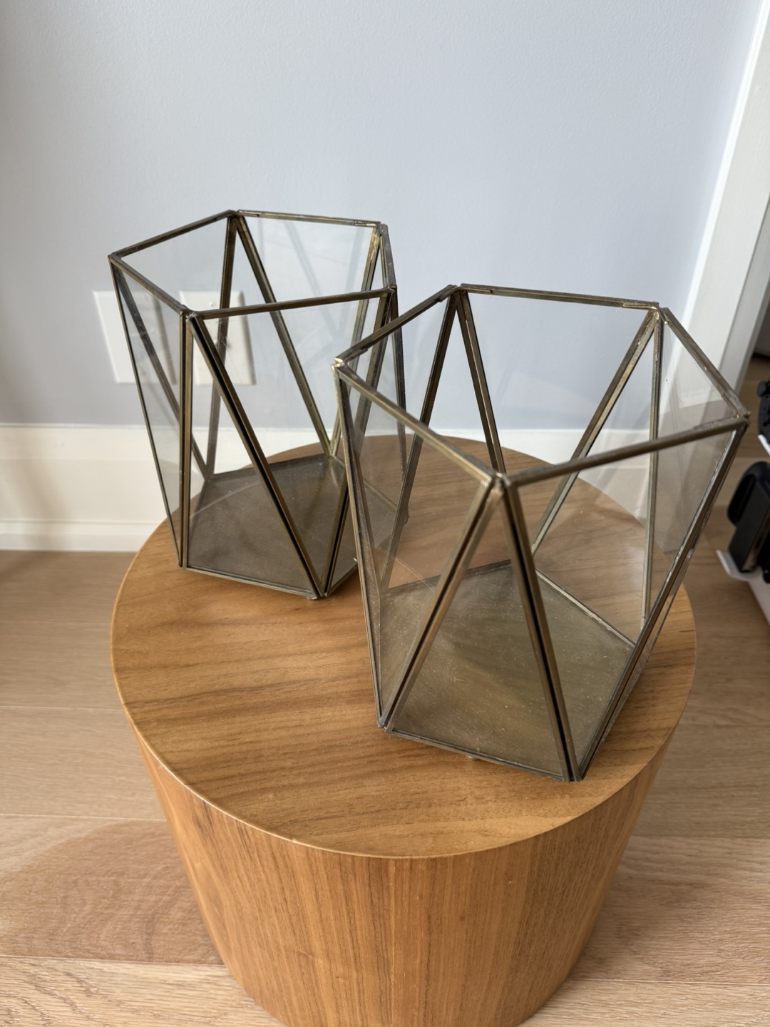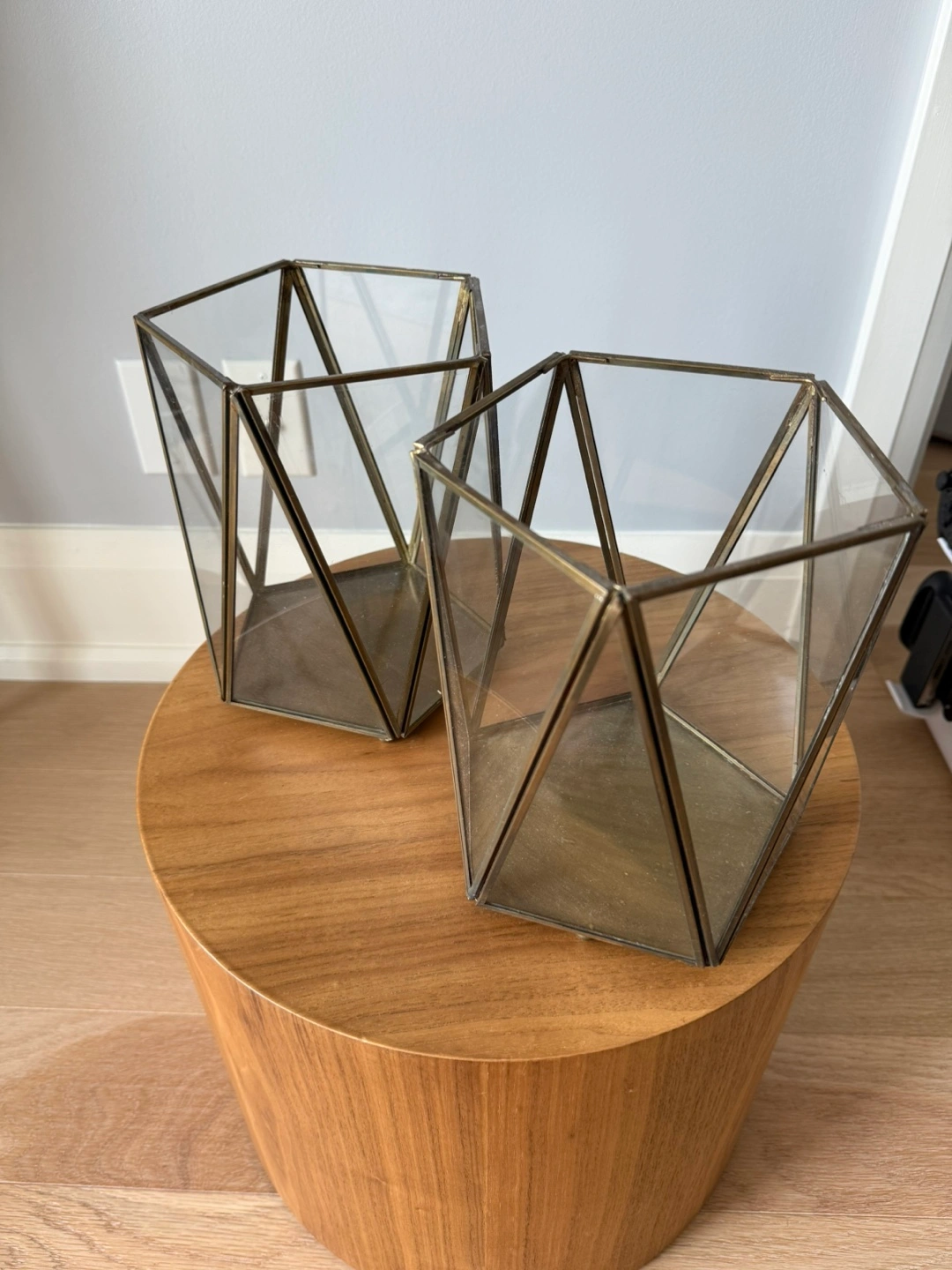 Selling a set of two geometric candle holders. They have a lovely modern design with glass panels and a metallic frame. Perfect for adding a touch of elegance to any room!
