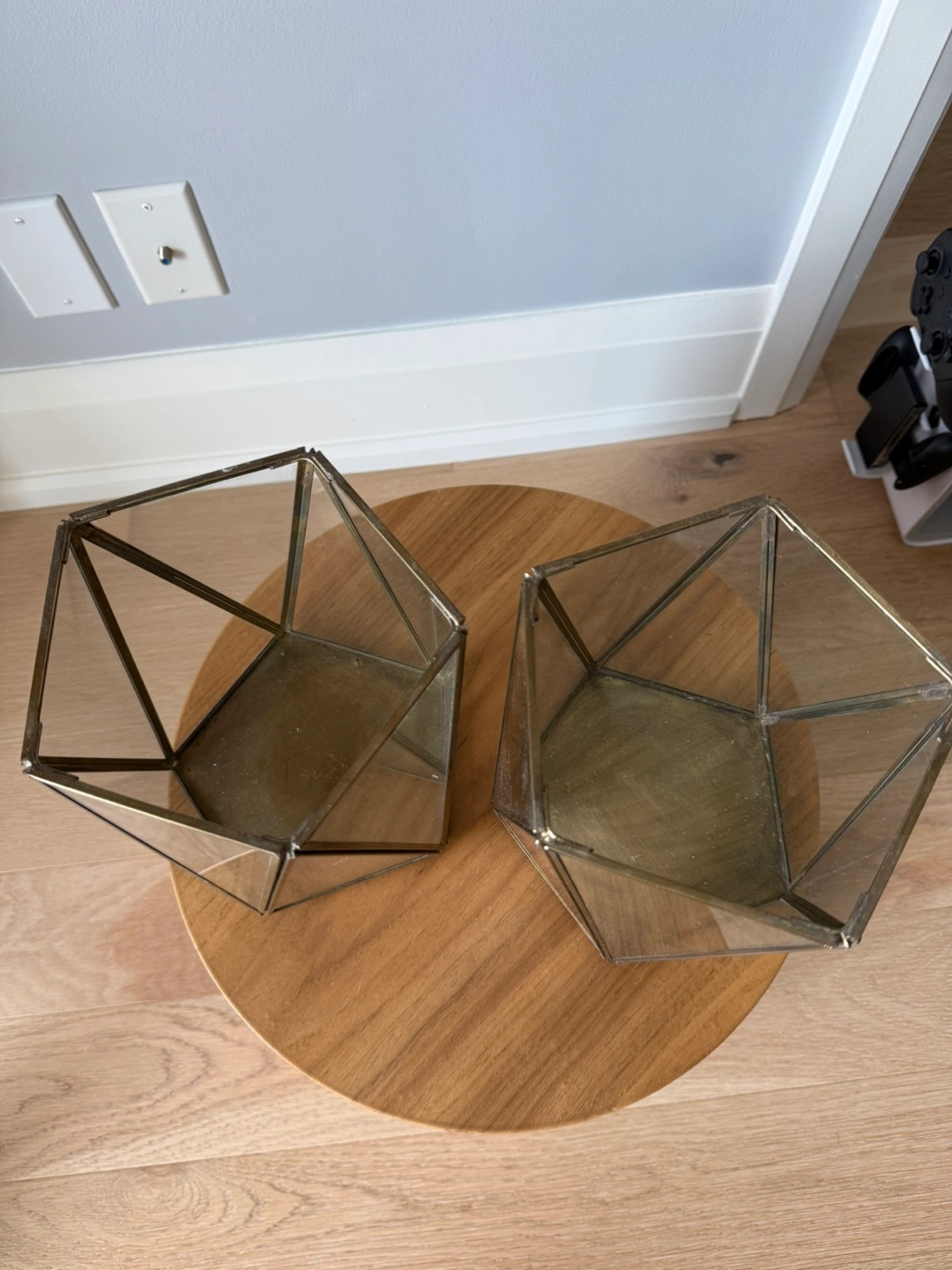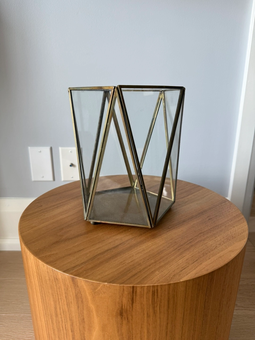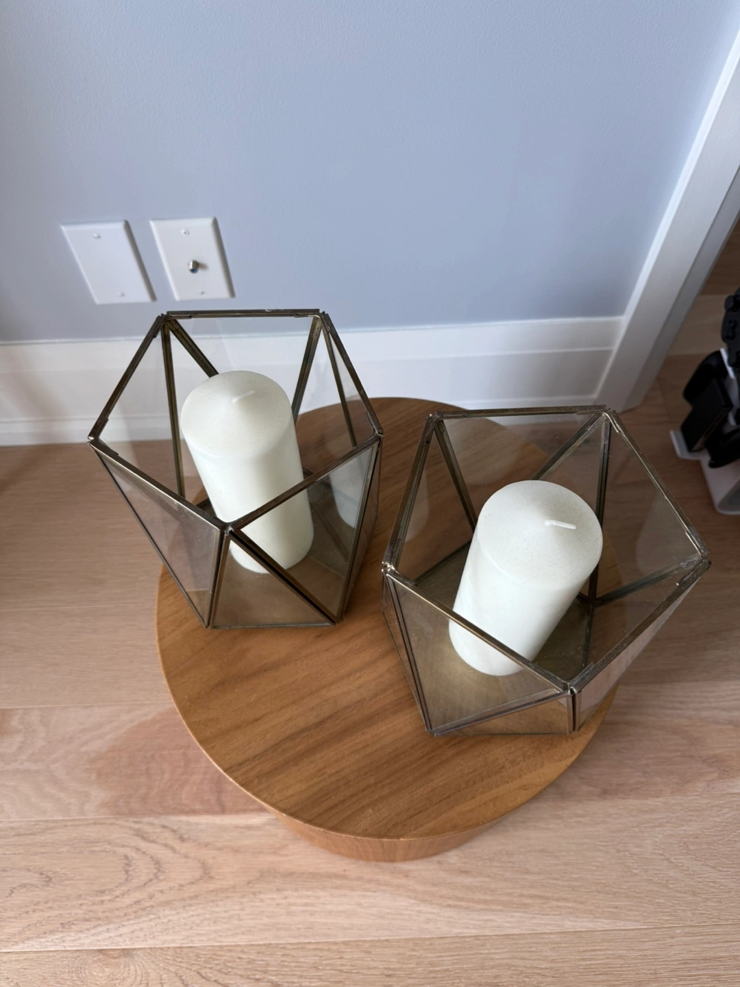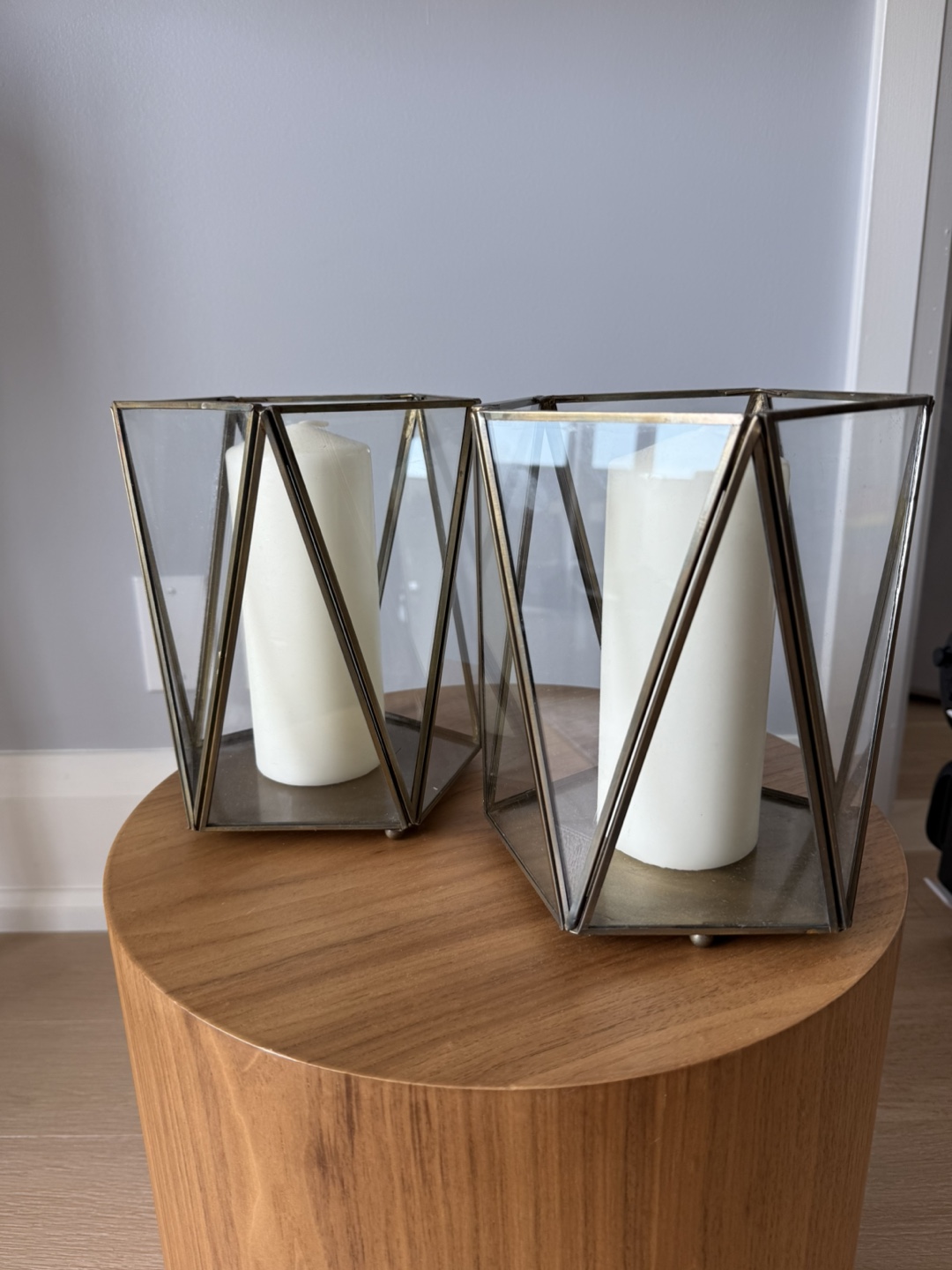 Selling a set of two geometric candle holders. They have a lovely modern design with glass panels and a metallic frame. Perfect for adding a touch of elegance to any room!
