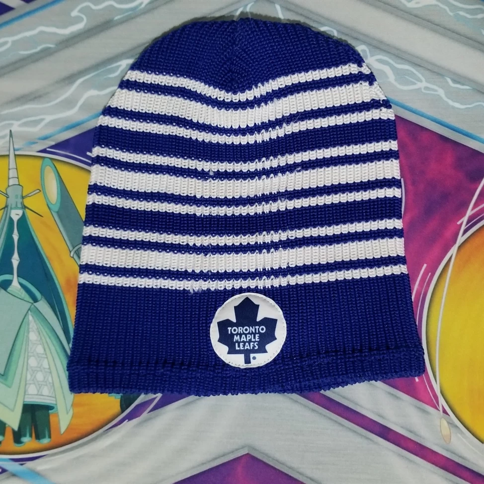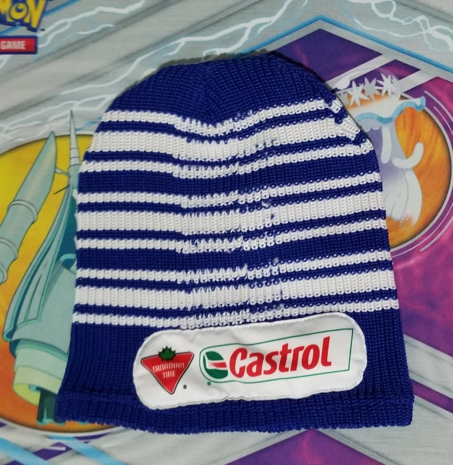 Selling a Toronto Maple Leafs toque featuring the Castrol logo! It's in great condition and perfect for showing your team spirit. The toque is blue and white striped and is a great way to stay warm during the colder months while supporting your favourite hockey team