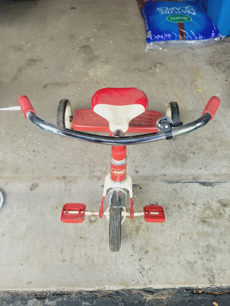 Selling a classic Radio Flyer tricycle! It's red and white, perfect for a little one learning to ride. It has some signs of use, but it's still in good condition for lots of fun adventures.
