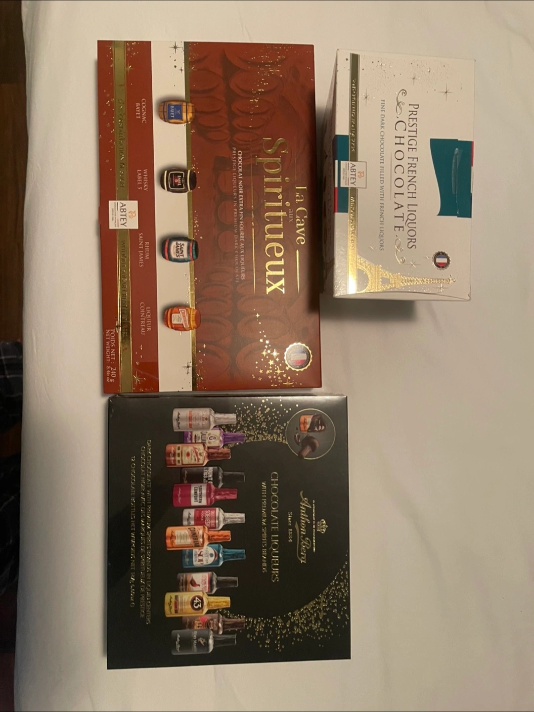 Selling a collection of chocolate liqueurs from Abtey and Anthon Berg. These are fine dark chocolates filled with premium spirits brands. Perfect for a treat or a gift!