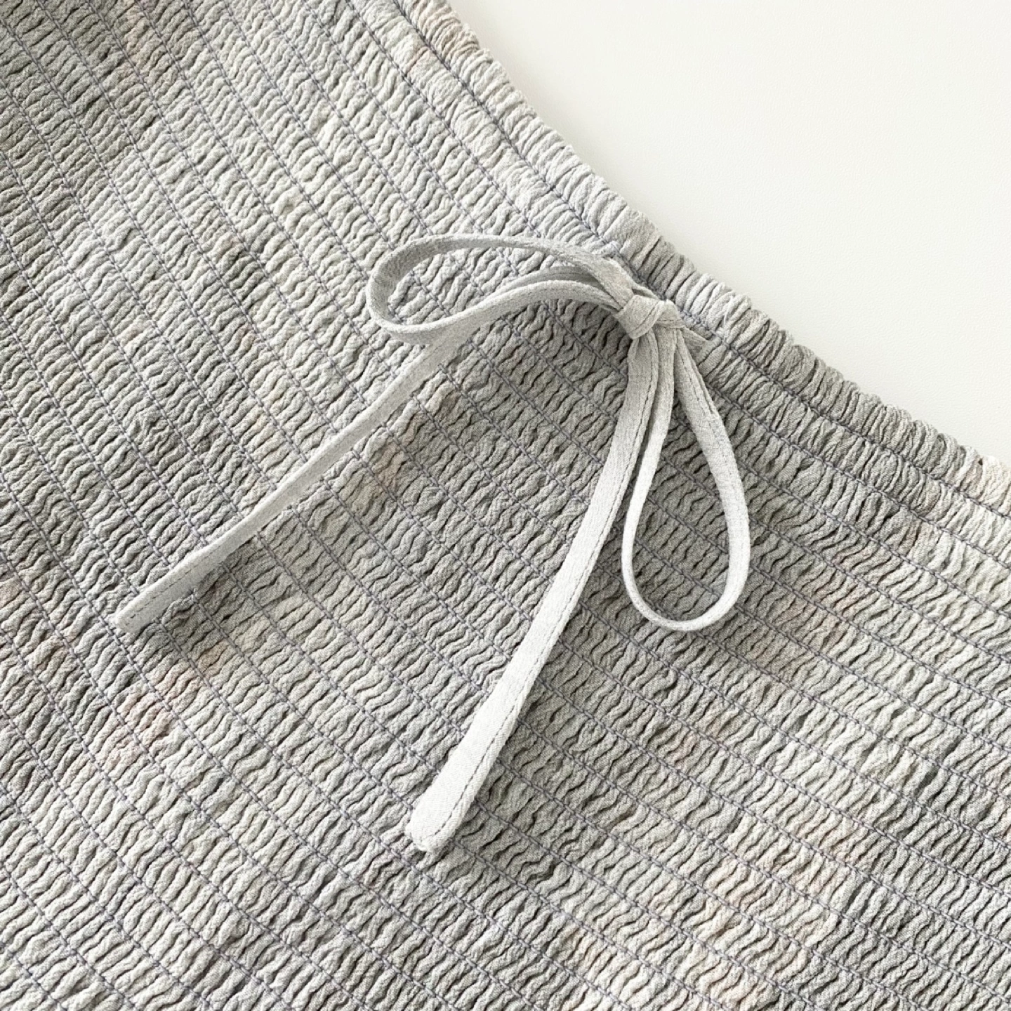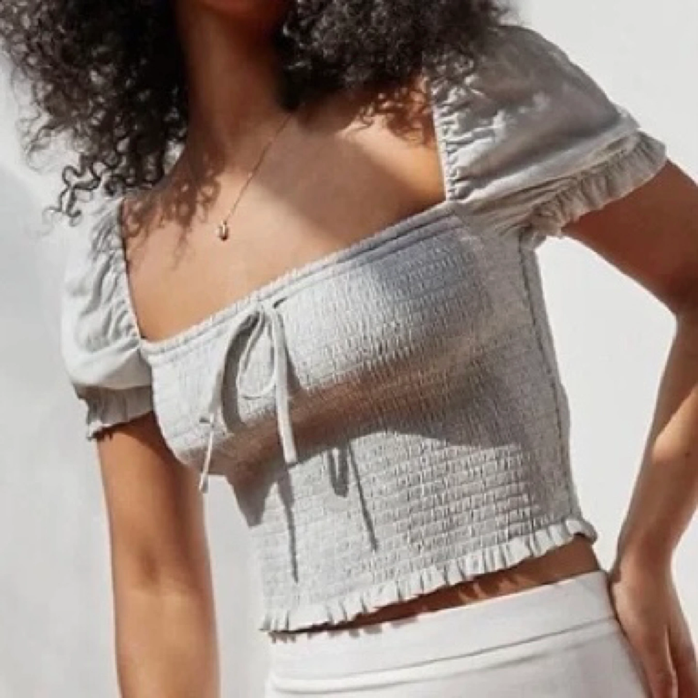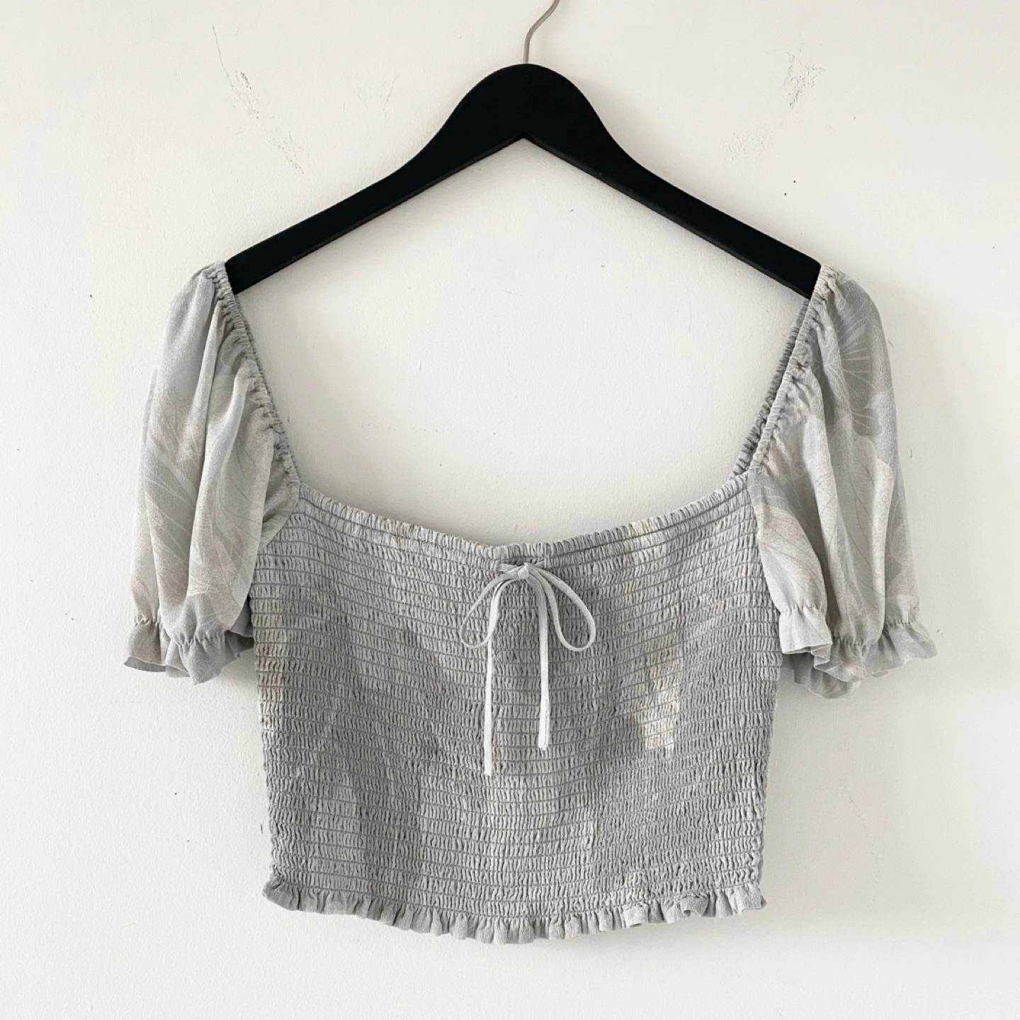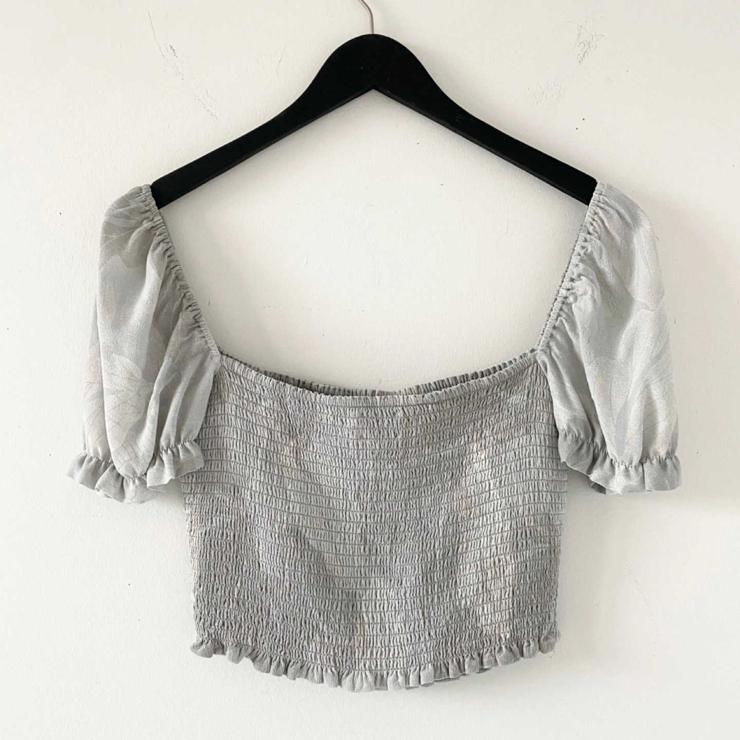 This is a smocked blouse with a square neckline, puff sleeves and a ruffle detail at the waist. There's no staining or damage. It's clean and in excellent condition.