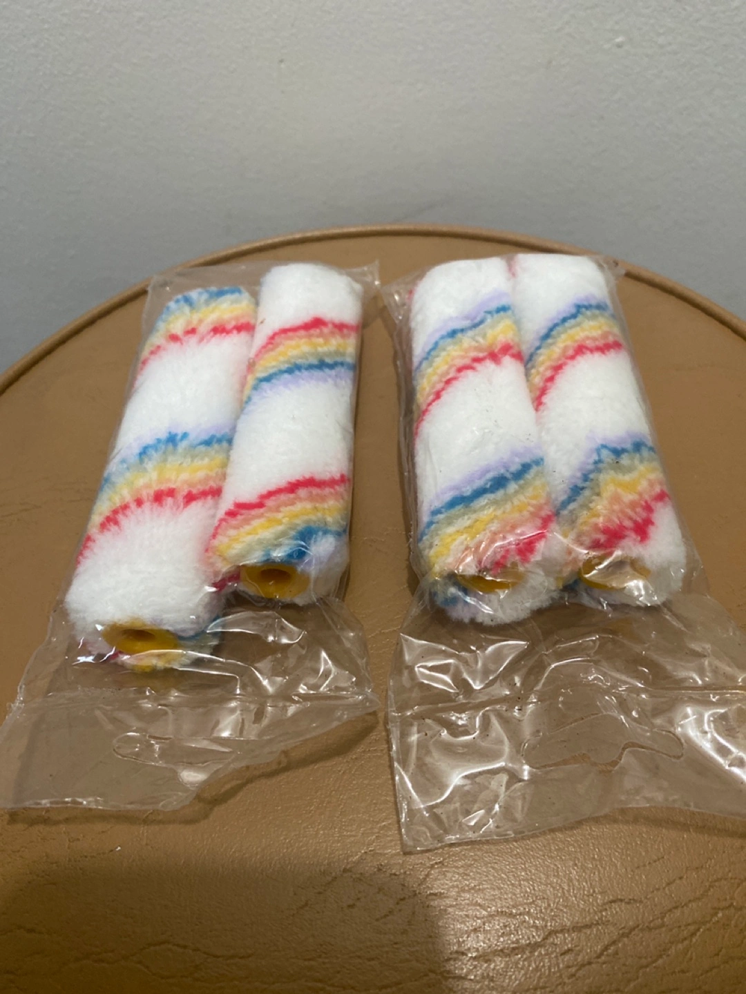 Two packs of paint roller refills (4 inches long), brand new and still in their original packaging. Each pack contains two rollers with a colourful striped pattern. Perfect for your next painting project!
