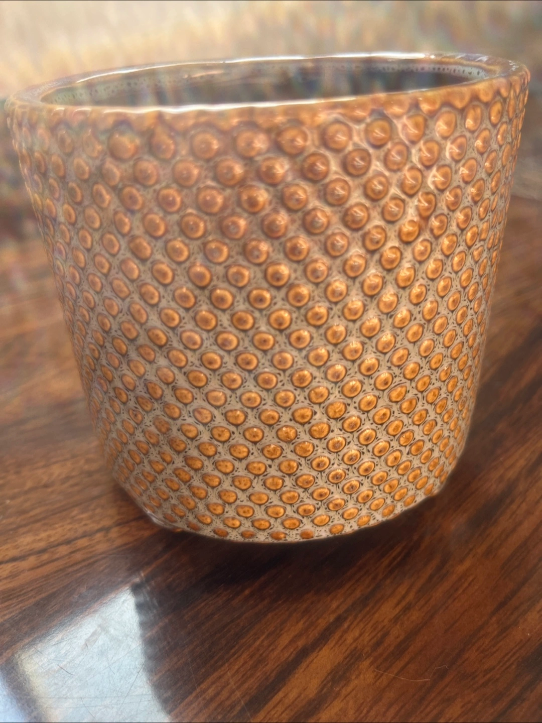 Selling a decorative ceramic pot with a unique textured pattern. It's in great shape and would look lovely with a small plant or as a standalone piece on a shelf. The pot has a warm, earthy tone that would complement various home decor styles. It measures approximately 4 inches in diameter and 4 inches in height.