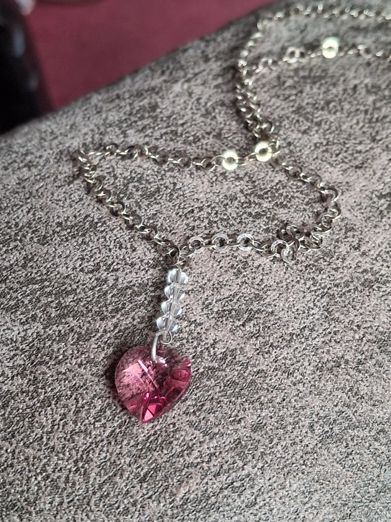 A lovely sterling silver chain necklace featuring a pink heart-shaped pendant. The pendant has some clear crystals above the heart. Perfect for adding a touch of sparkle to any outfit!