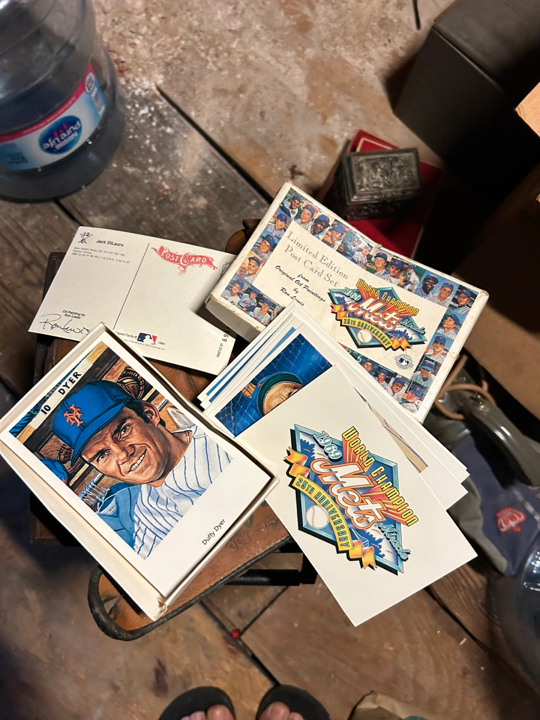 Selling a limited edition post card set from the 1969 Mets World Champions. The set features original oil paintings by Ron Lewis and includes postcards of players like Jack DiLauro and Duffy Dyer