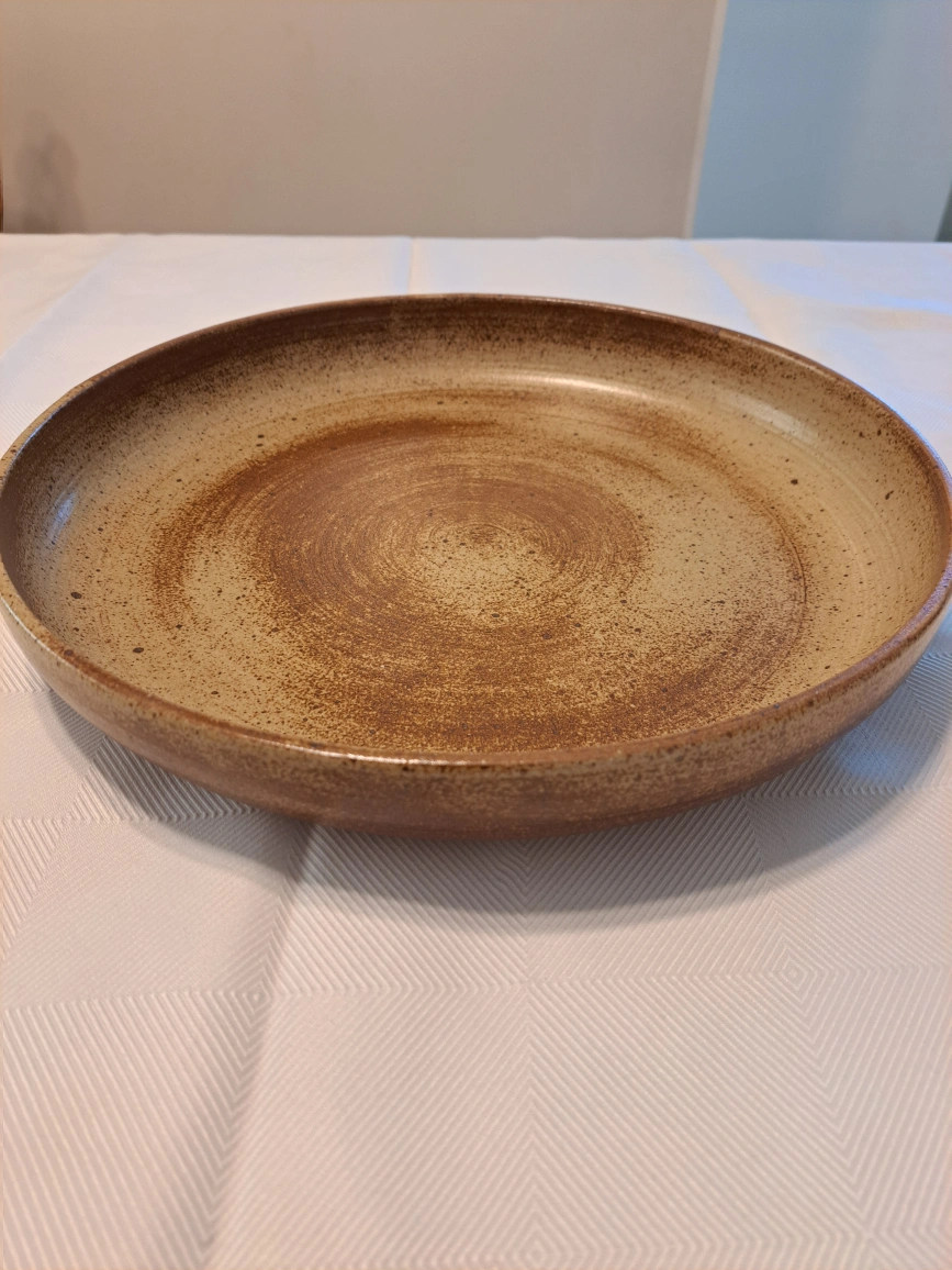 I'm selling a handmade pottery plate. It has a unique, rustic look with a speckled finish in earthy brown and beige tones. Perfect for adding a touch of artisanal charm to your table setting!