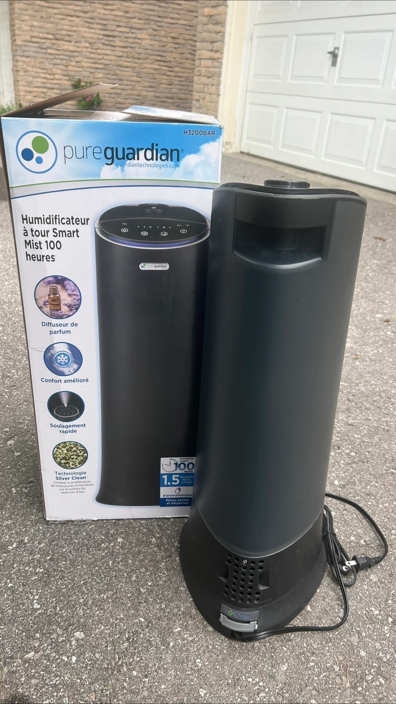 Selling a PureGuardian Humidifier Smart Mist that can run for 100 hours. It's in great condition and comes with the box. It features diffusion of perfume, improved comfort, and rapid relief. It also has 1.5 gallons capacity