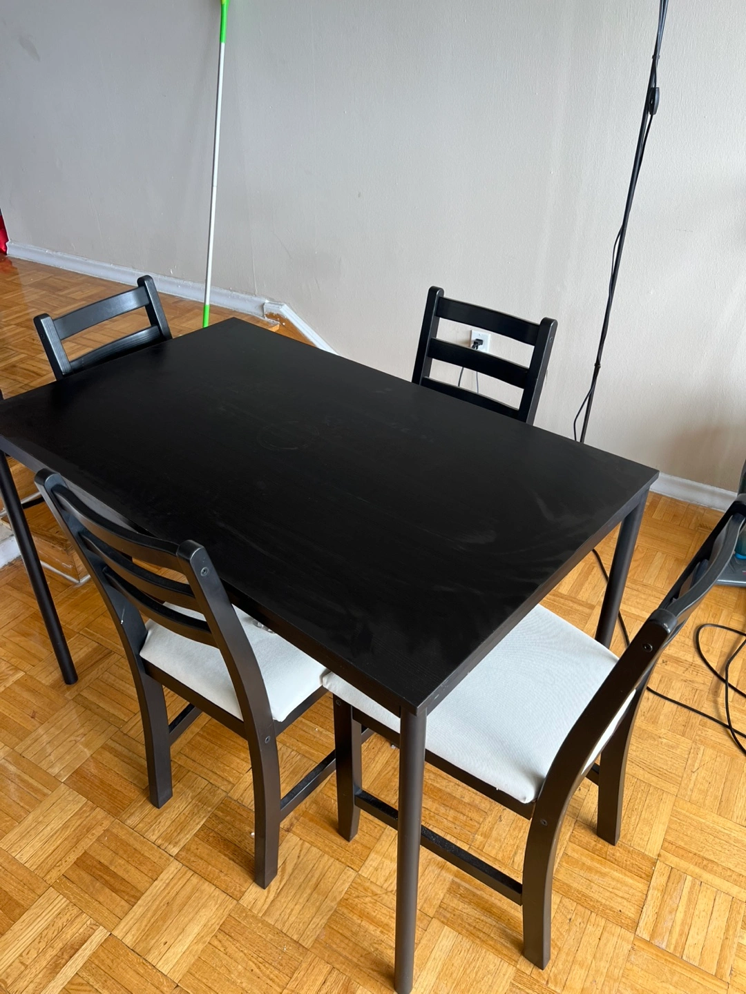 Selling a black dining table complete with four chairs. It's in great shape and would be perfect for a small dining area or kitchen nook. The chairs have white cushions, adding a nice contrast to the black frame. A simple and stylish set!