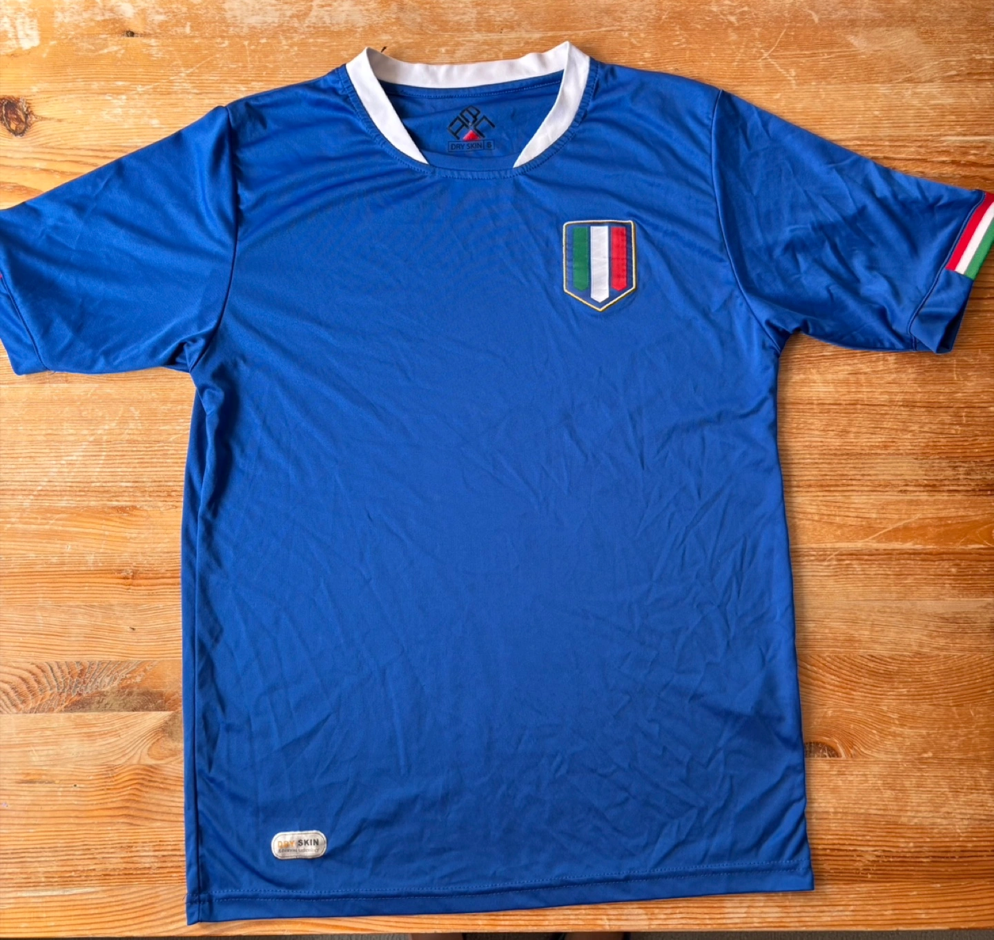 Selling a blue Italy kid soccer jersey! It features the Italian flag colours on the sleeve and the Italian crest on the chest. Great for showing your support!