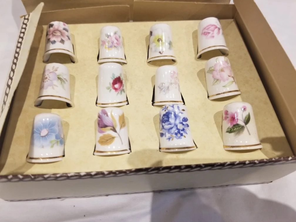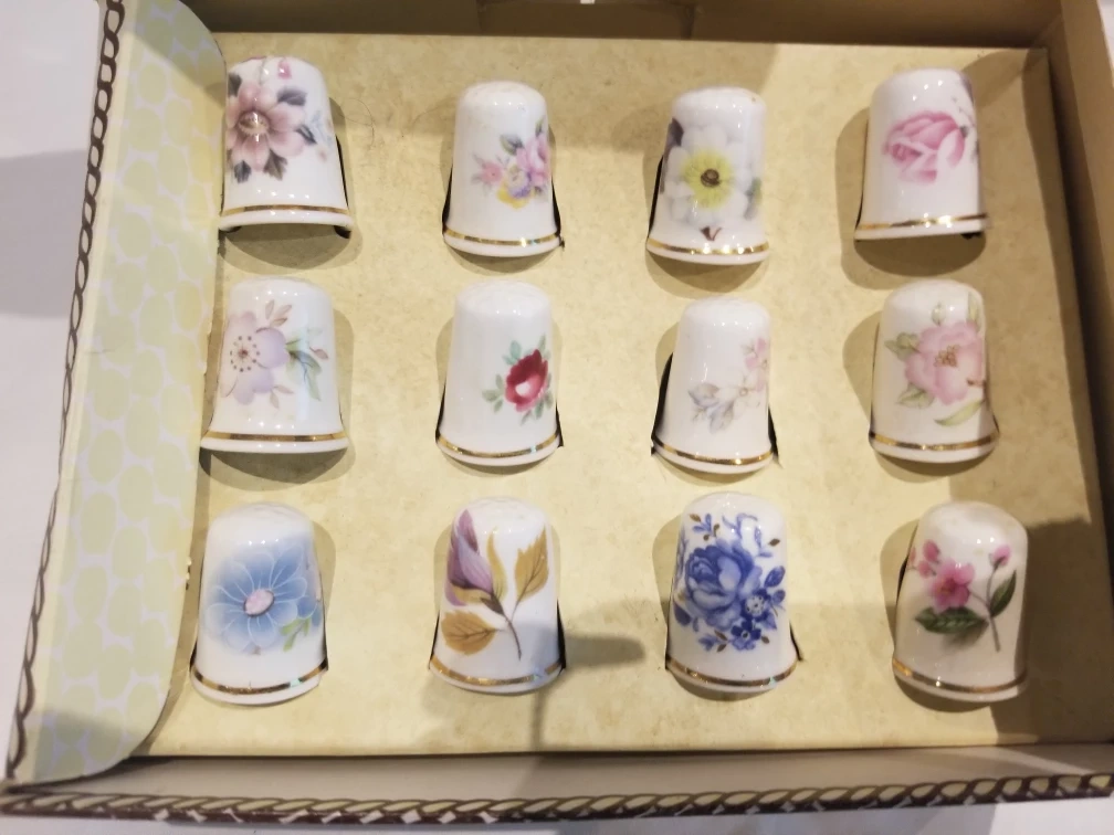 Selling a set of exclusive collector's thimbles in their original box from The Thimble Box of Staffordshire, England. Each thimble features a unique floral design and gold trim. A lovely addition to any collection!