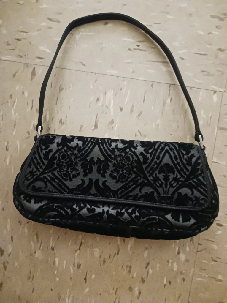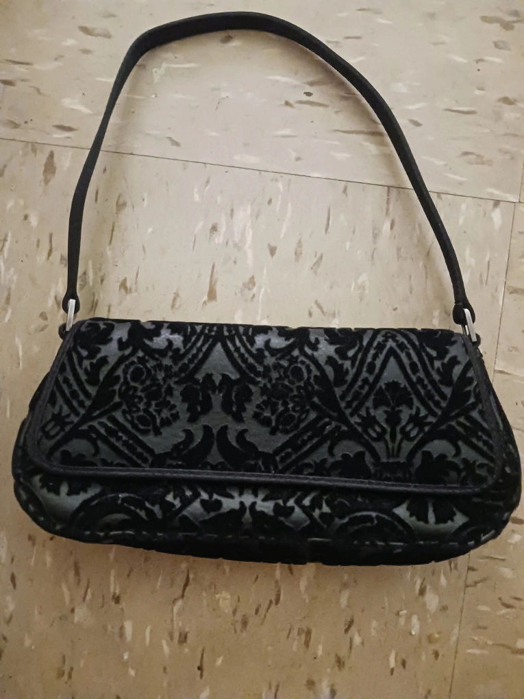 This is a beautiful vintage shoulder bag with a unique black velvet floral pattern. It's in great condition and perfect for adding a touch of elegance to any outfit. The bag is a stylish accessory for any occasion!