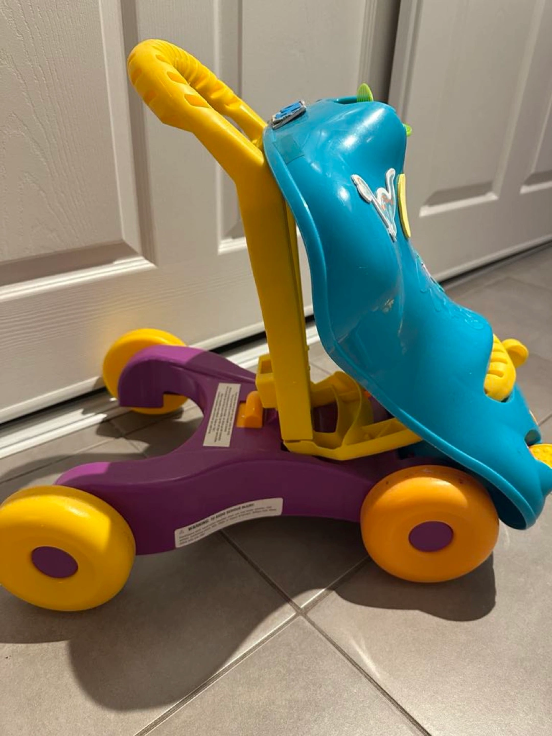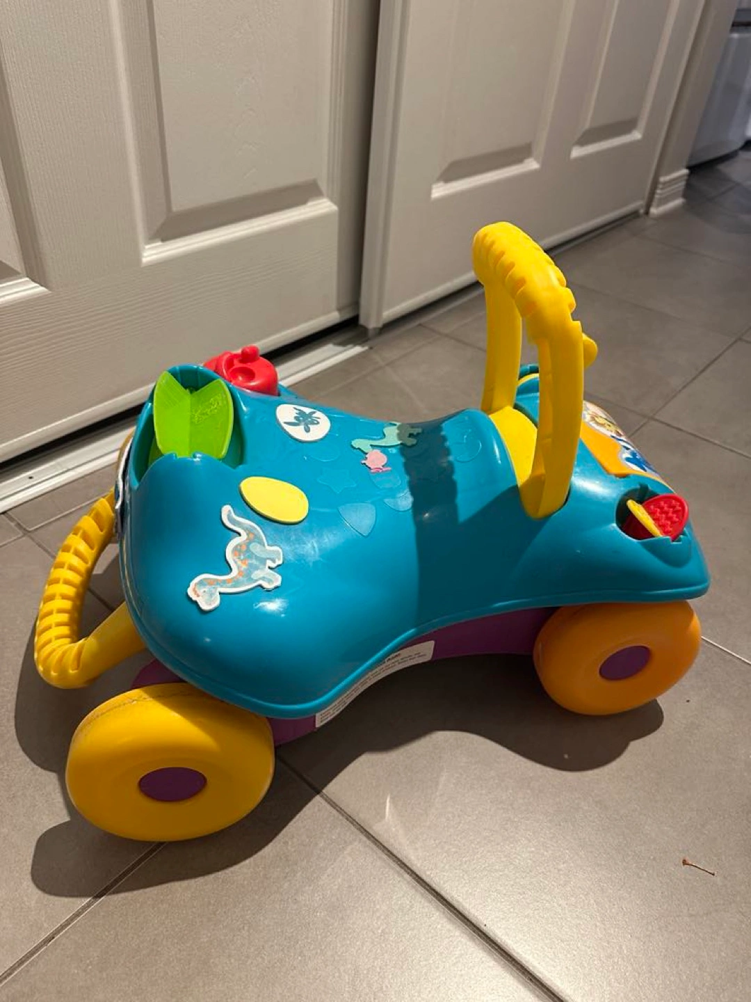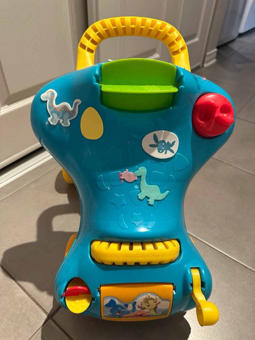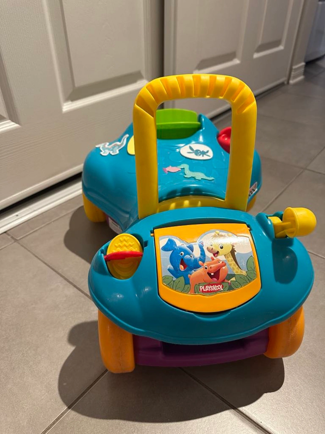 This Playskool 2-in-1 Sit 'n Ride Walker is perfect for little ones learning to walk or ride! It's in great condition and ready for a new home. It has a fun design with bright colours and playful animal characters.