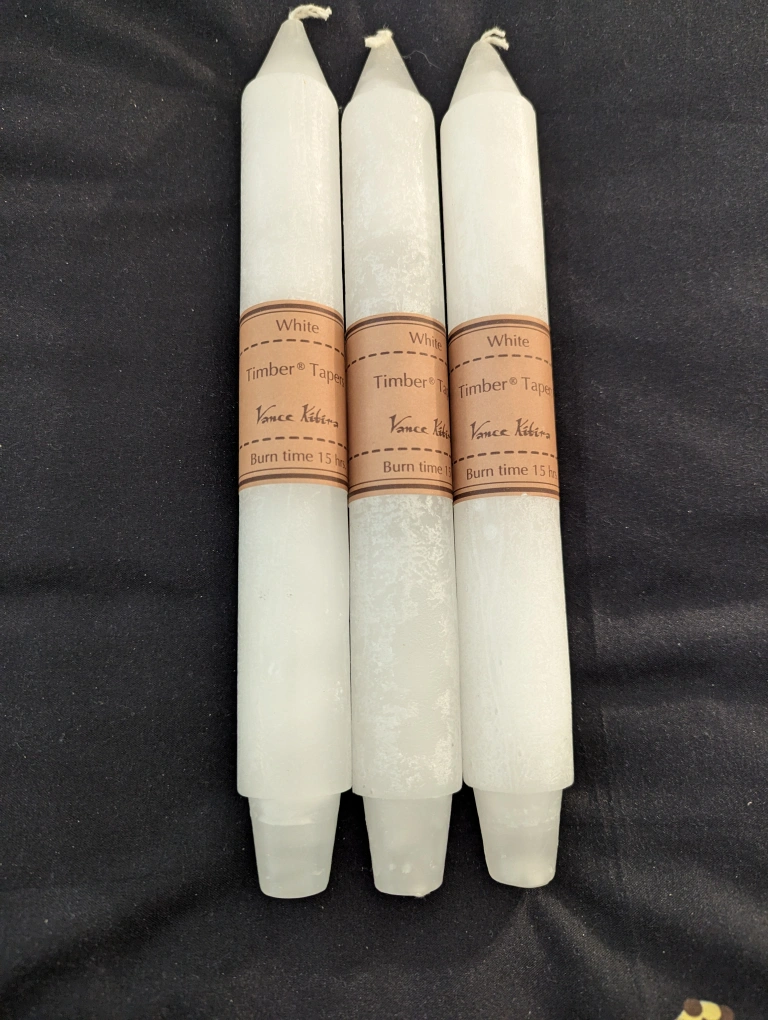 Selling three Vance Kitira Timber Tapers candles in white! Each candle has a burn time of 15 hours