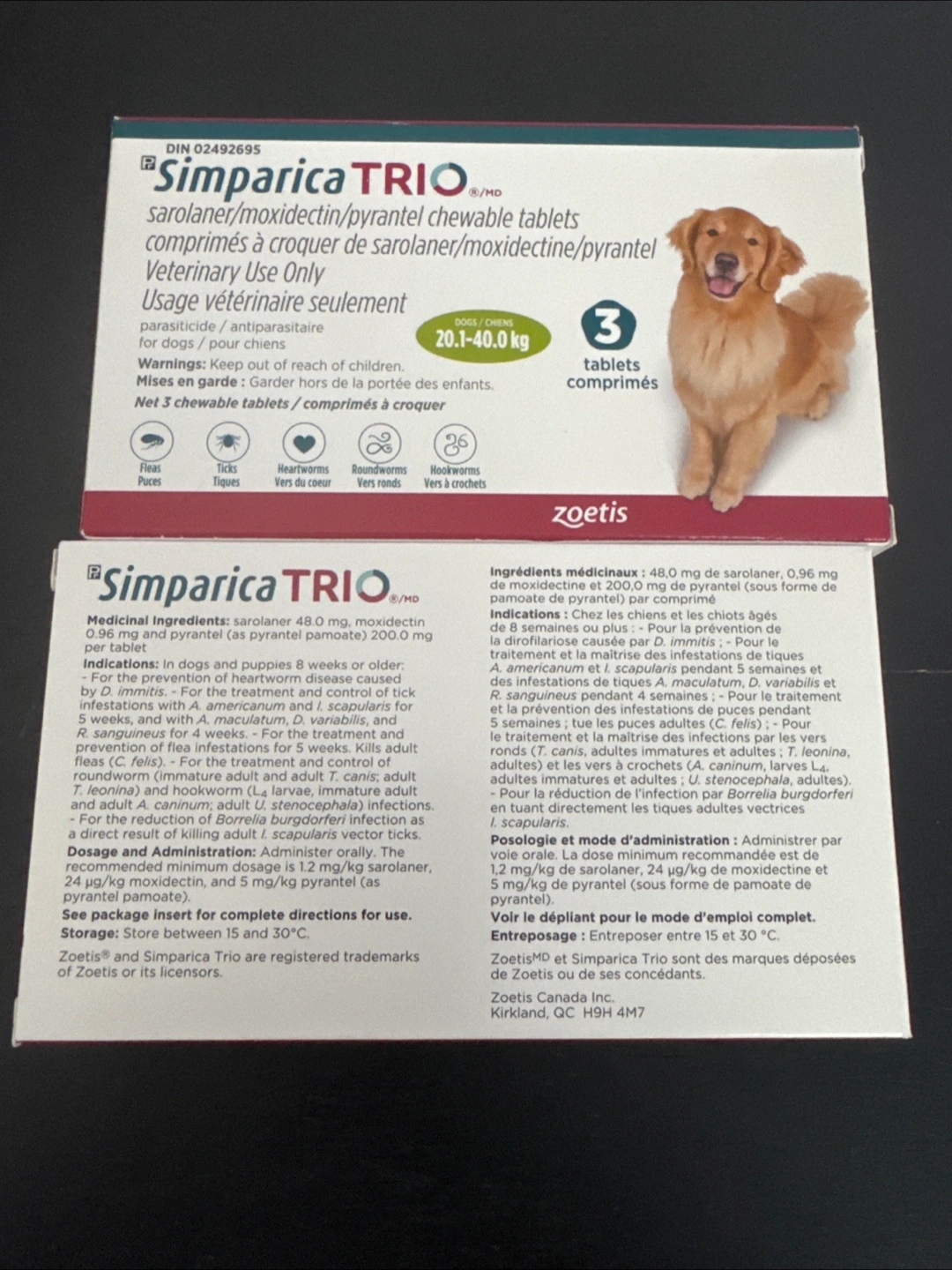 Selling a pack of Simparica Trio chewable tablets for dogs! These are for dogs weighing between 20.1-40.0 kg and each tablet contains sarolaner, moxidectin, and pyrantel. It protects against fleas, ticks, heartworms, roundworms, and hookworms. There are 3 tablets in the package. 1 full box left for $90. Also have one box with only 2 tablets for sale for $60. Selling due to loss of our dog.
