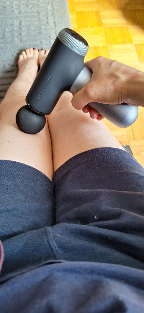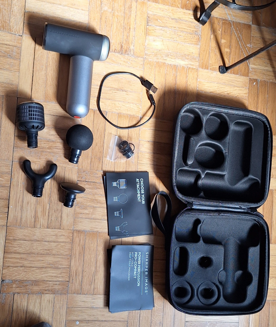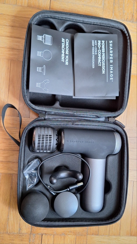 This is a Sharper Image Power Percussion Pro Compact deep tissue massager. It comes with all the attachments, charger, and the original case. It is in excellent condition and ready to help you recover after a workout or just relax your muscles!