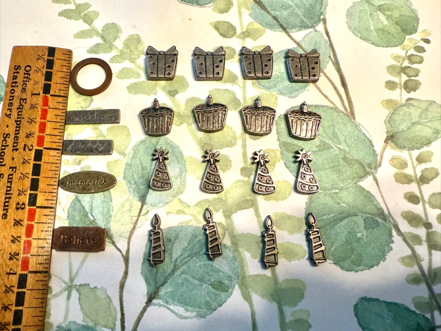 A collection of assorted metal craft embellishments including gift boxes, cupcakes, party hats, candles, and word charms such as 'wisdom', 'friendship', 'memories', and 'believe'. These are great for scrapbooking, card making, and other craft projects