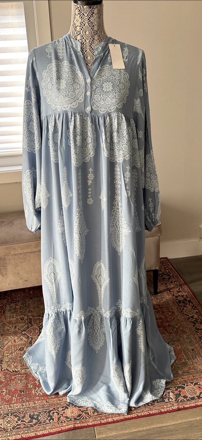This lovely boho-style maxi dress features a beautiful blue colour with white mandala-like prints. It has a relaxed, flowy fit and long sleeves, perfect for a casual day out or a special occasion. Perfect for the summer Size is large/ Xl - 27 inches across the chest Fastest pick up or delivery possible to certain areas.