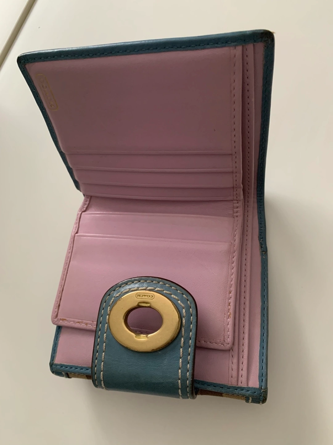 Selling a cute Coach wallet with the signature canvas design and a turnlock closure. It comes with its original dust bag. The wallet features a light blue trim and a pink interior.