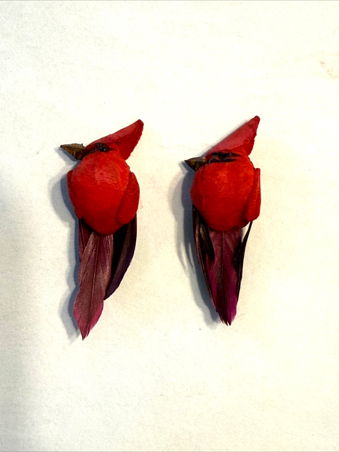 Selling a set of two decorative cardinal birds. They feature a vibrant red colour and feather details. Perfect for adding a touch of nature to your home decor! **Please note, they need to be glued on a surface to sit up.**